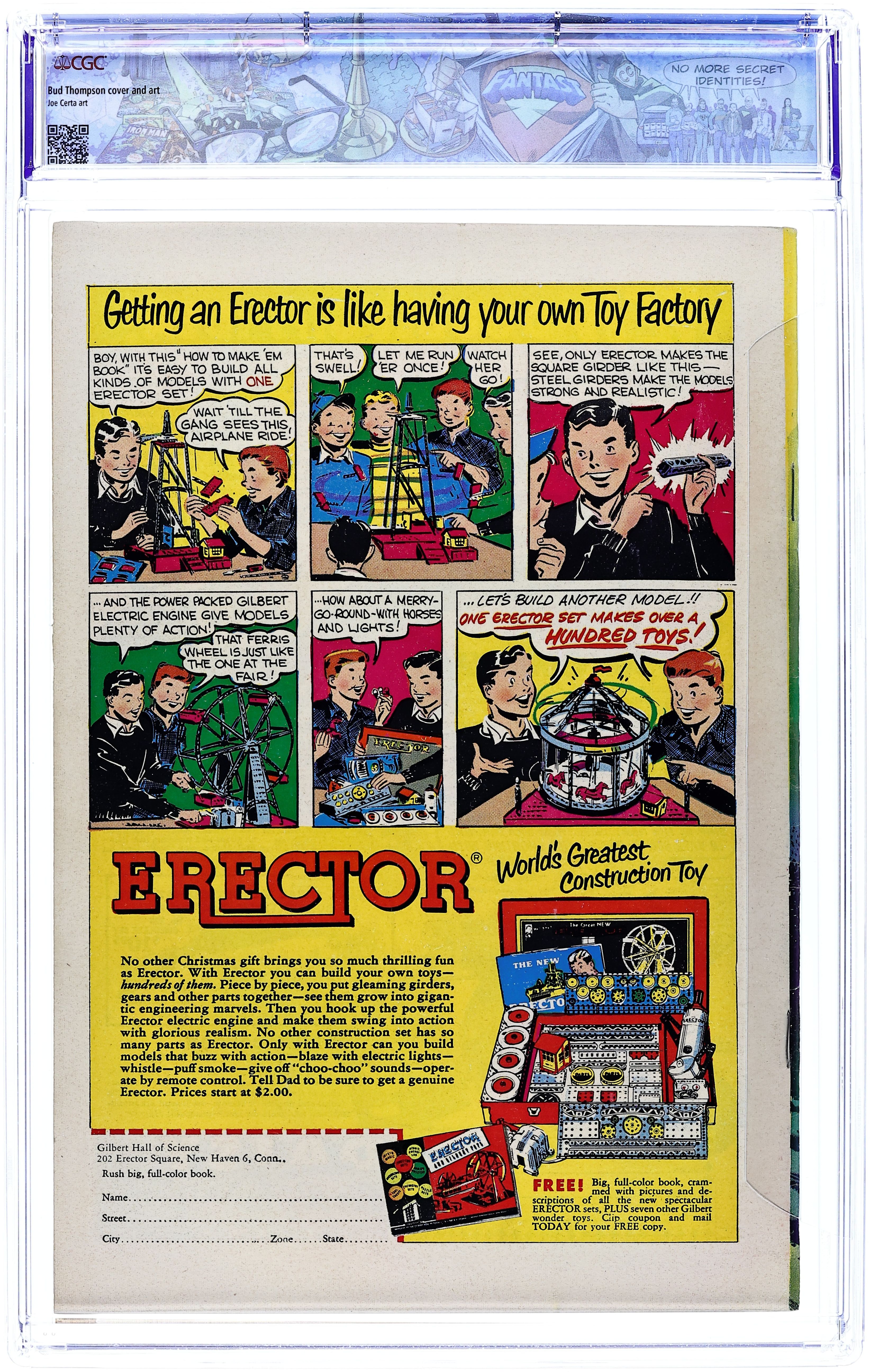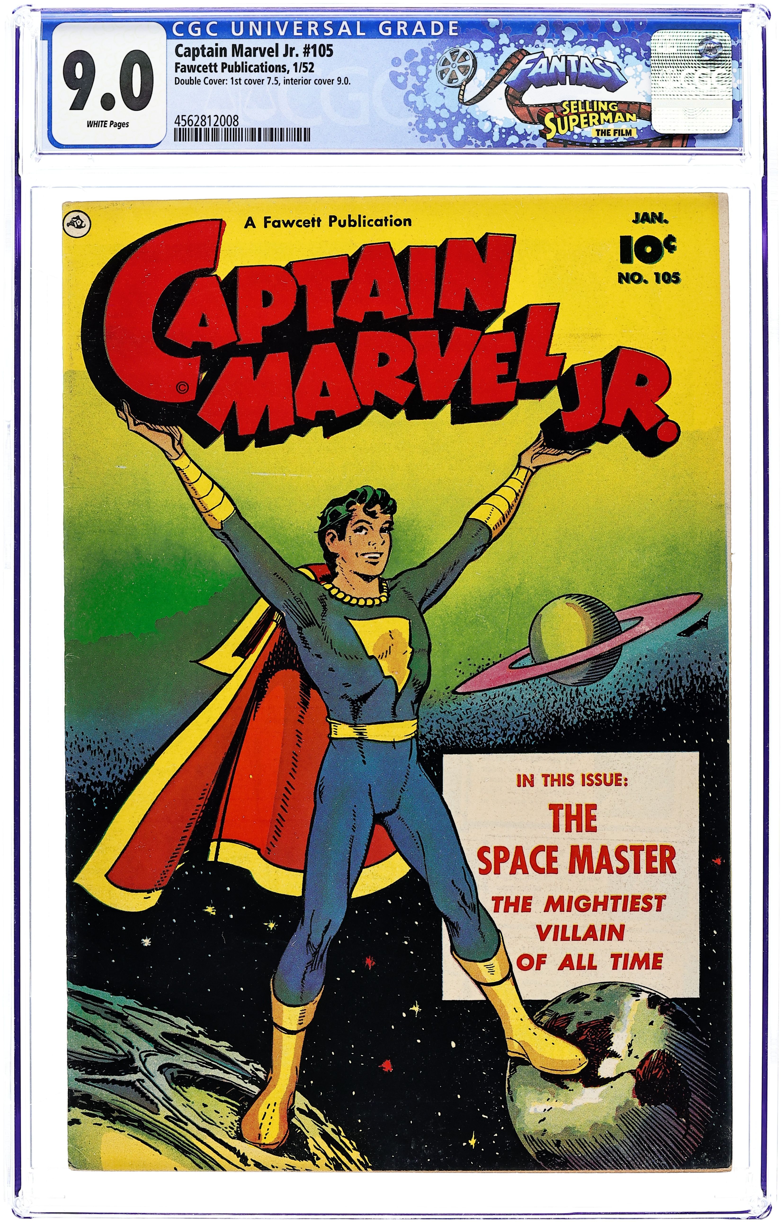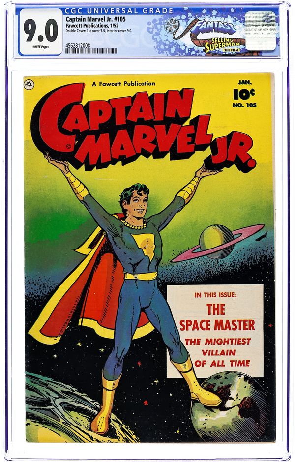 Cover by Bud Thompson. Stories by Bill Woolfolk, and Howard Boughner. Art by Bud Thompson, Howard Boughner and Joe Certa. Superhero action with Freddy Freeman, who gains the same powers as his hero Captain Marvel, better known these days as Shazam. The cosmic being known as The Spacemaster sends a threatening message to Earth by rearranging the stars themselves. Sivana Jr. travels back in time to outbid the US on the Louisiana Purchase and become emperor of half of North America. A hobo accidentally drinks Professor Edgewise's latest invention, and becomes an invisible menace. Plus an early ad for View-Master. Capt. Marvel Jr. Battles the Spacemaster; Dizzy Daizy Is Undernourished; Kanvasback: Bon Voyage; The History Hoax; Judge Smudge; Payment in Paste; Invisible Guest. 32 pages, Full Color. Cover price $0.10.