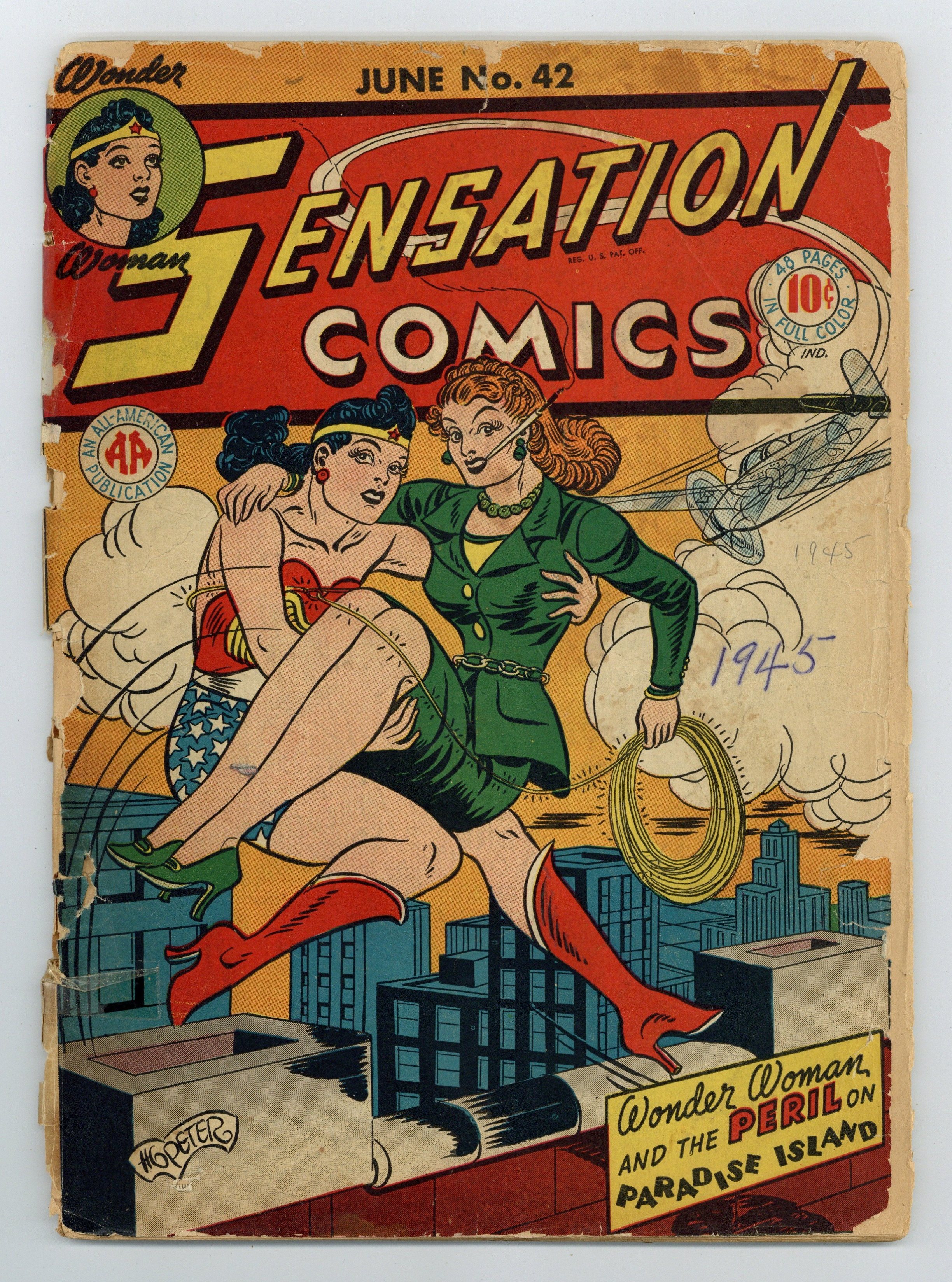 Cover art by Harry G. Peter. Peril On Paradise Island starring Wonder Woman, art by Harry G. Peter; While testifying at the trial of a spy who is accused of stealing U.S. secret weapon plans, Wonder Woman accidently loses her golden lasso, which is found and used against the Princess. Trouble In Double! starring Little Boy Blue, art by Frank Harry. The Devil's Apprentice starring The Black Pirate, art by Alfonso Greene. Crime Goes to School starring Mr. Terrific, art by Stan Aschmeier [as Stan Josephs]. The Hayville Hobby-Horse starring Wildcat, art by Joe Gallagher. 52 pgs. $0.10. Cover price $0.10.