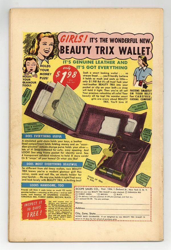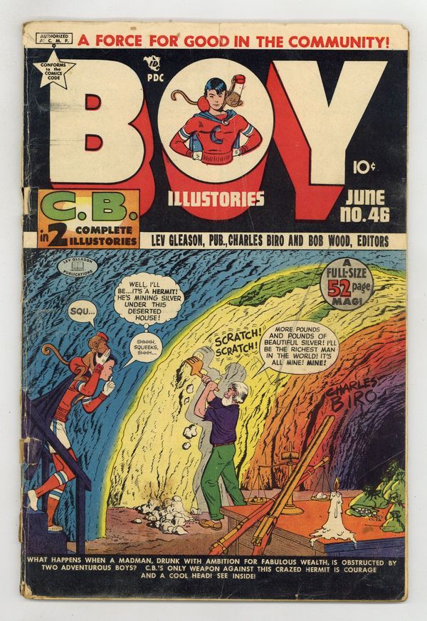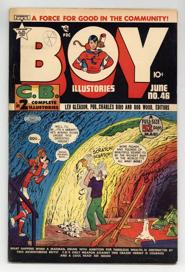Cover by Charles Biro. Stories and art by Norman Maurer, C.H. Moore, and Charles Biro. An anthology title from publisher Lev Gleason and his primary creator, Charles Biro, featuring teen hero Crimebuster and his nemesis Iron Jaw. Two adventurous boys discover a strange secret under an abandoned house: a hermit's one-man silver-mining operation. Famous Eccentrics features Blackbeard and famed royal mistress Lola Montez. A condemned criminal writes a story for a magazine, advising young people to avoid his mistakes. Also featuring a vintage ad for "the Raised Eagle Club," offering reproductions of military service ribbons. Crimebuster; Thug-Uglies; Daredevil Calls the Fiddler's Tune. 48 pages, Full Color. Cover price $0.10.