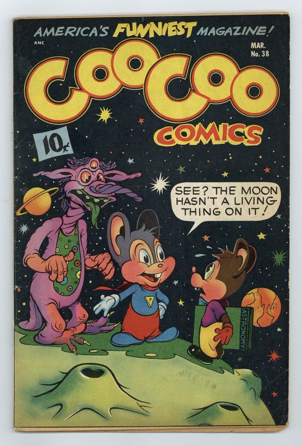 Contains three Frank Frazetta illustrations. Frazetta illustrations appear in seventeen consecutive issues of Coo Coo Comics (1942) (#34-50). Contains funny animal stories. In order of appearance: "Supermouse"; "Dodger de Squoil" story by Jack Cosgriff, art by Al Hubbard; "Tuffy" art by Jack Bradbury; "Custer" art by Bob Wickersham; "Douglas and Duncan" art by Jack Bradbury; "Cubby" art by Lynn Karp; and "Colonel Punchy Penguin". Illustrated text stories: "The Elephant Who Never Remembered: Pachy the Pachyderm Was a Friendly Creature!" by Elizabeth Starr, illustration by Frank Frazetta; and "The Playful Bear: Billy Beaver Teaches Cub Freddy a Good Lesson!" by Donald Bayne Hobart, illustration by Frank Frazetta. 52 pages. Full color. Cover price $0.10.