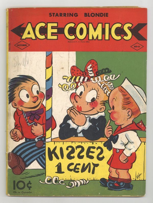 Published Oct 1940 by David McKay Publishing.$75.00Cover art by Joe Musial. The Phantom strips, scripts by Lee Falk, art by Ray Moore. Pete the Tramp strips by Clarence D. Russell. Jungle Jim strips, art by Alex Raymond. Katzenjammer Kids strips, art by H.H. Knerr. Barney Google strips, art by Billy DeBeck. Seein' Stars strips, art by Feg Murray. Tim Tyler's Luck strips, art by Lyman Young. Just Kids strips by A.D. Carter. Blondie strips, art by Chic Young. Prince Valiant strips, art by Hal Foster. Tillie the Toiler strips, art by Russ Westover. Curley Harper at Lakespur strips, art by Lyman Young. Teddy and Sitting Bull strips, art by Joe Musial. Room and Board strips, art by Gene Ahern. 68 pgs. $0.10. Cover price $0.10.