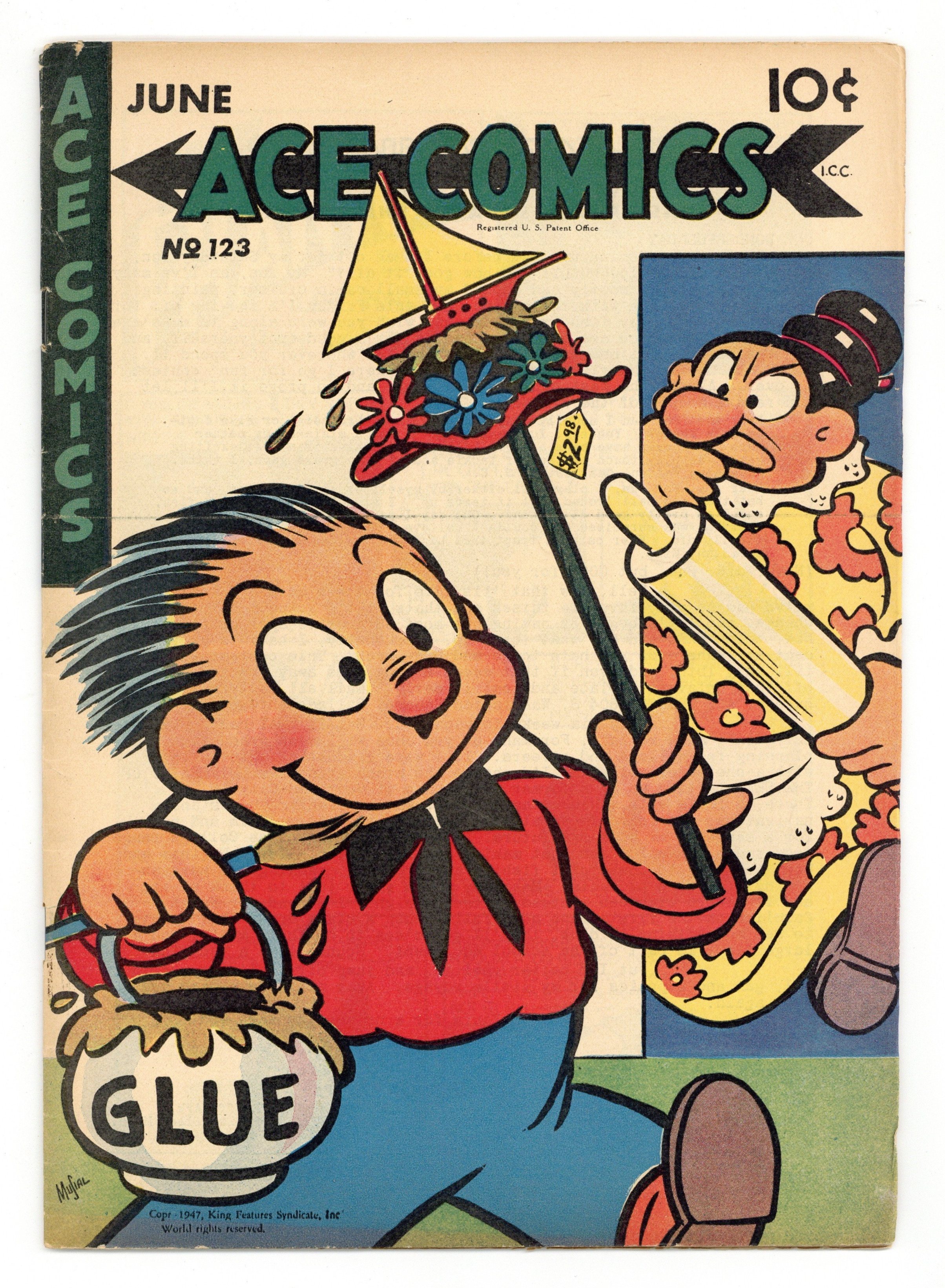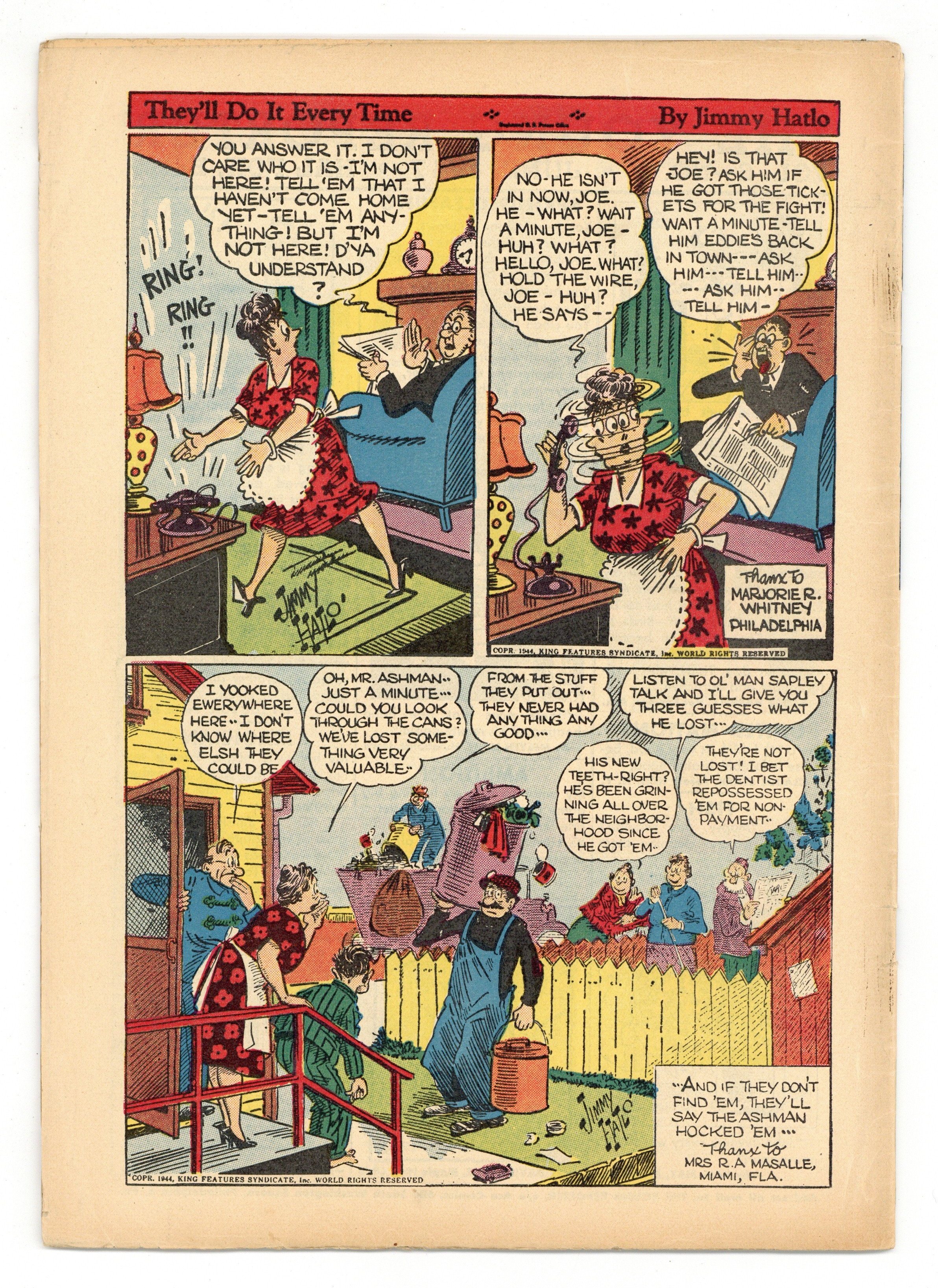Cover art by Joe Musial. The Phantom strips, script by Lee Falk, art by Ray Moore. Daffy Doodles strips, art by Doc Winner. Katzenjammer Kids strips, art by H.H. Knerr. Tim Tyler's Luck strips, art by Lyman Young. Pete the Tramp strips by Clarence D. Russell. Jungle Jim strips, art by Alex Raymond. Barney Google strips, art by Billy DeBeck. Blondie strips, art by Chic Young. Teddy and Sitting Bull strips, art by Joe Musial. Tillie the Toiler strips, art by Russ Westover. Prince Valiant strips, art by Hal Foster. They'll Do It Every Time strips, art by Jimmy Hatlo. 36 pgs. $0.10. Cover price $0.10.