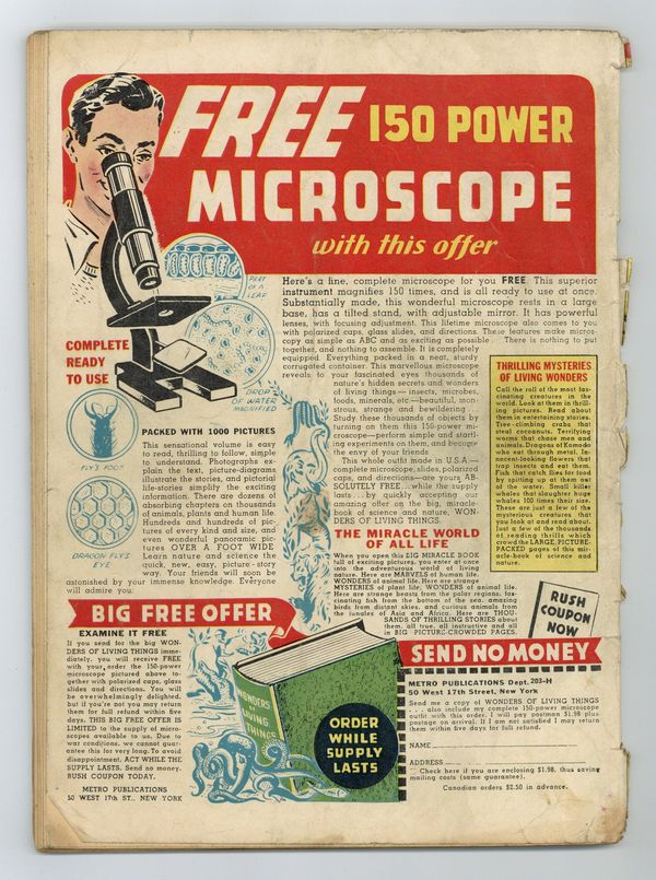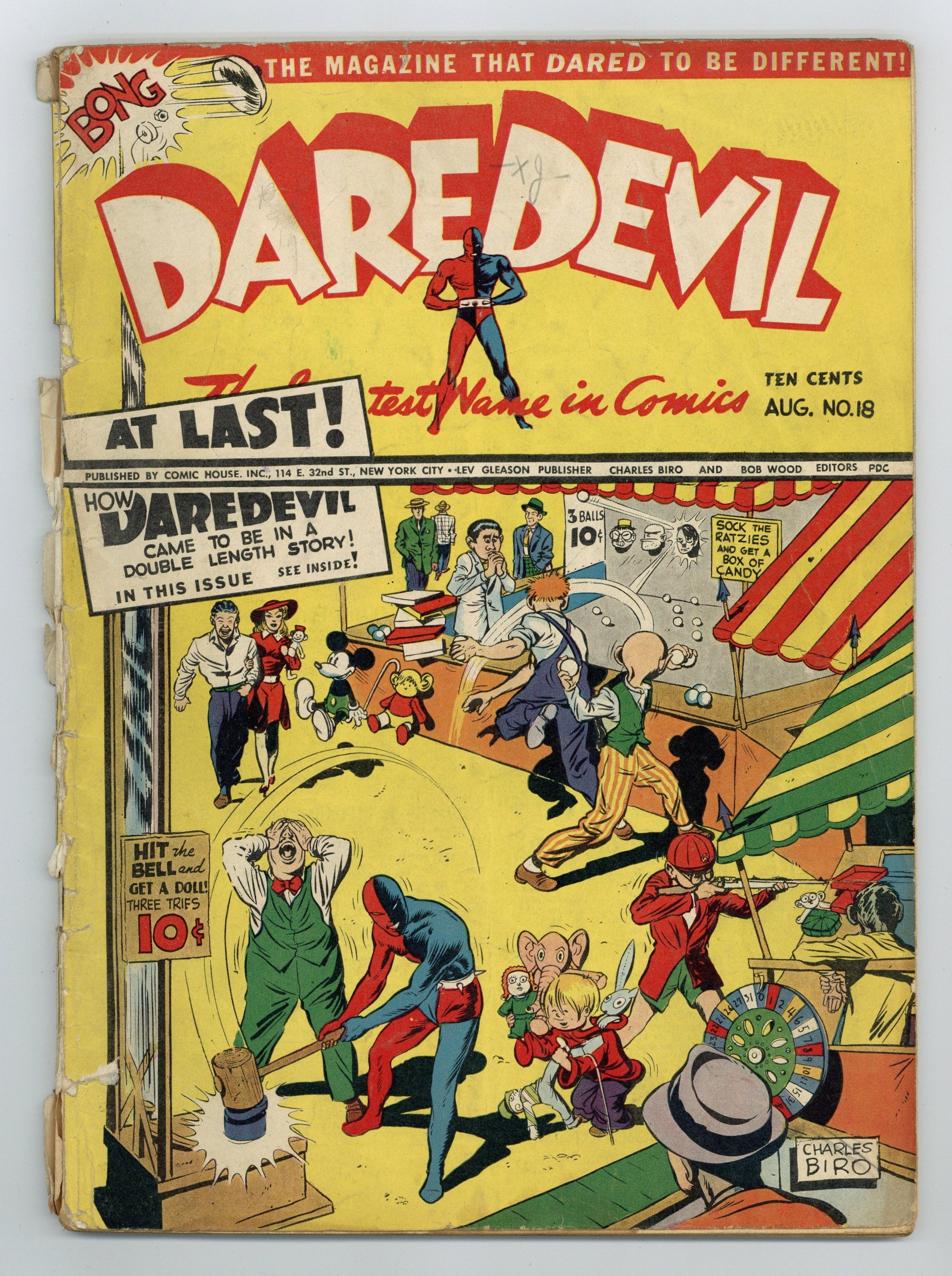 Cover by Charles Biro. Stories and art by Charles Biro, Dick Wood, Bob Wood, Carl Hubbell, Basil Wolverton, and Dick Briefer. This early superhero title was one of the comics that made publisher Lev Gleason a major player during the Golden Age. Daredevil reveals his true origin to the Little Wise Guys: he mastered the boomerang while being raised by a tribe of aborigines in Australia. Rhyming reporter Scoop Scuttle falls asleep and dreams of being a war correspondent in North Africa, in a story by comics legend Basil Wolverton. Teen inventor Dickie Dean tests out a hypnosis machine on Nazi soldiers, in a story with art by Dick Briefer. Daredevil; Sniffer; Dickie Dean; Scoop Scuttle; The Pirate Prince; Crimebuster: Too Tough to Fight; The Claw: The Ghost Meets the Claw's Uncle. 60 pages, Full Color. Cover price $0.10.