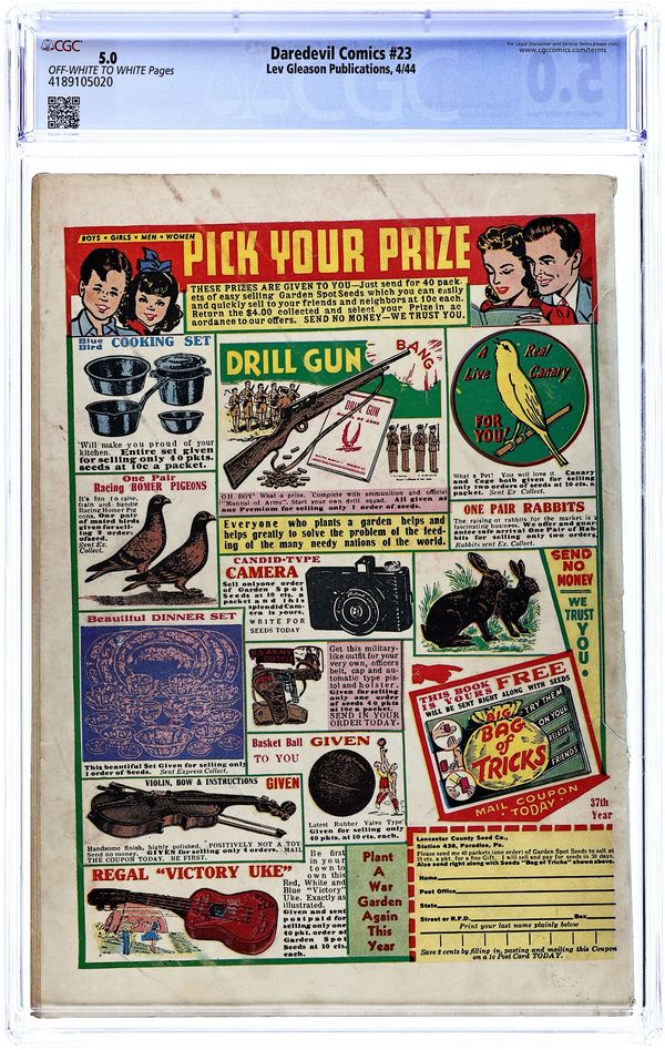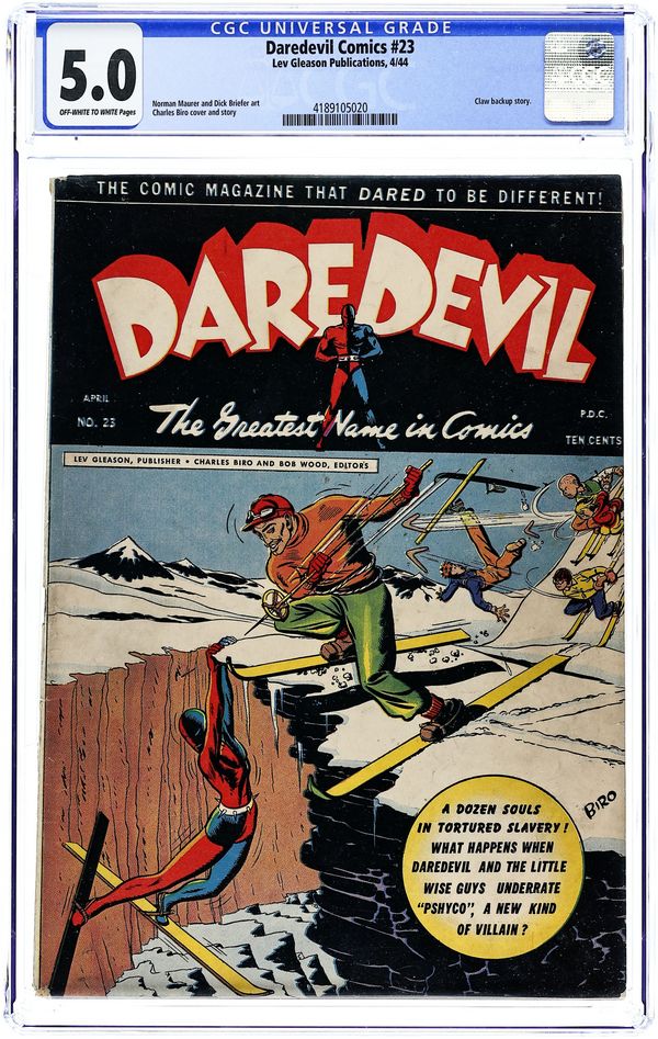 Cover by Charles Biro. Stories and art by Charles Biro, Norman Maurer, Dick Wood, Bob Wood, Dick Hall, Jack Warren and Dick Briefer. This early superhero title was one of the comics that made publisher Lev Gleason a major player during the Golden Age. Daredevil and The Little Wise Guys face the deadly millionaire called Pshyco on the ski slopes. Teen inventor Dickie Dean creates a Thought Transmitter, in a story with art possibly by Archie creator Bob Montana. The Pirate Prince's pal Droopy meets his dad, in a naval reunion in the tradition of Popeye and Poopdeck Pappy, with art by Dick Briefer. Also featuring a vintage ad for wartime "Victory Glasses": a set of tumblers featuring members of each branch of the US armed services smooching a cute civilian. Daredevil; Sniffer: The Strange Case of the Coded Pickles; Dickie Dean; Helpful Hank; The Pirate Prince; Crimebuster: Monkey Maneuvers; The Claw. 60 pages, Full Color. Cover price $0.10.