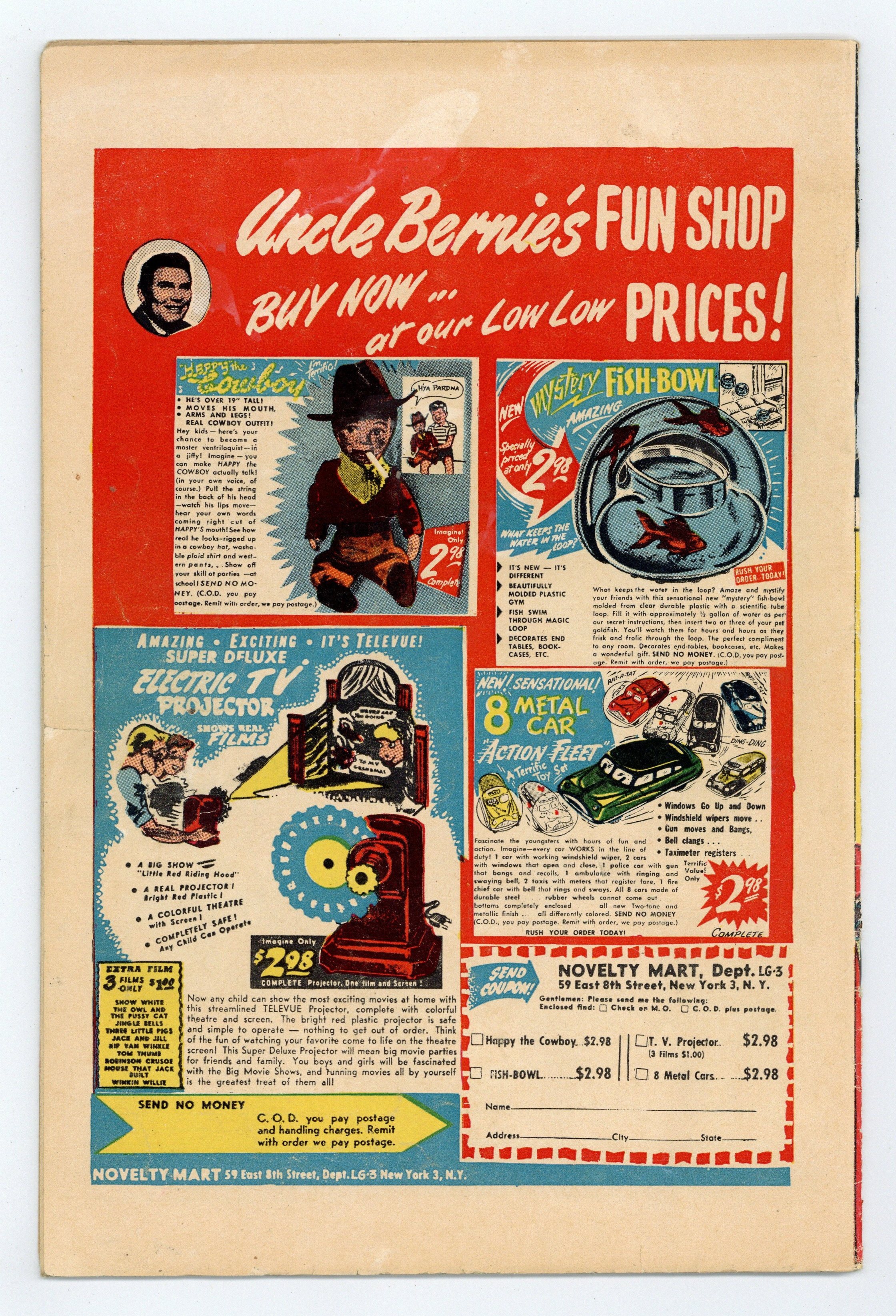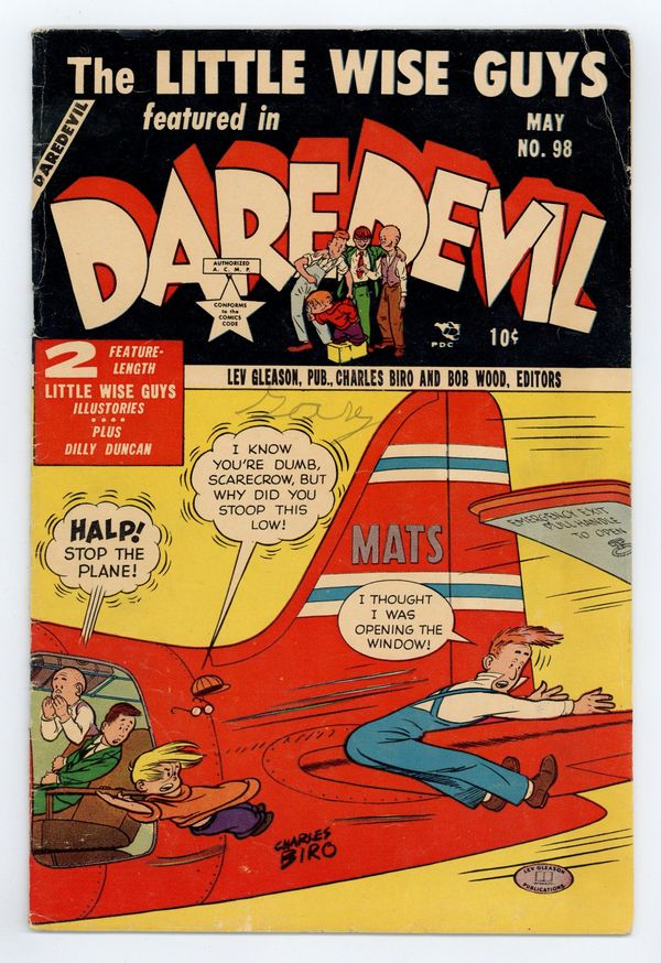 Cover by Charles Biro. Stories and art by Charles Biro, Norman Maurer, and William Overgard. This boys' adventure title was one of the comics that made publisher Lev Gleason a major player during the Golden Age. The Little Wise Guys head to scout camp and wind up entertaining troops with the USO. Dilly Duncan enlists his beautiful cousin Nancy to play a prank on his rival Gruesome Jones. The Little Wise Guys discover that their new pal Ronny is a pathological liar, and cheats on tests to boot. Also featuring Lev Gleason Comics Picture Trading Cards: Famous Fighting Planes. Little Wise Guys: Who's Excited; Dilly Duncan of Dorset High: Gruesome, the Great Lover; It's A Small World; Crimebuster: Killer-At-Large; Little Wise Guys: The Liar; Lev Gleason Trading Cards. 32 pages, Full Color. Cover price $0.10.