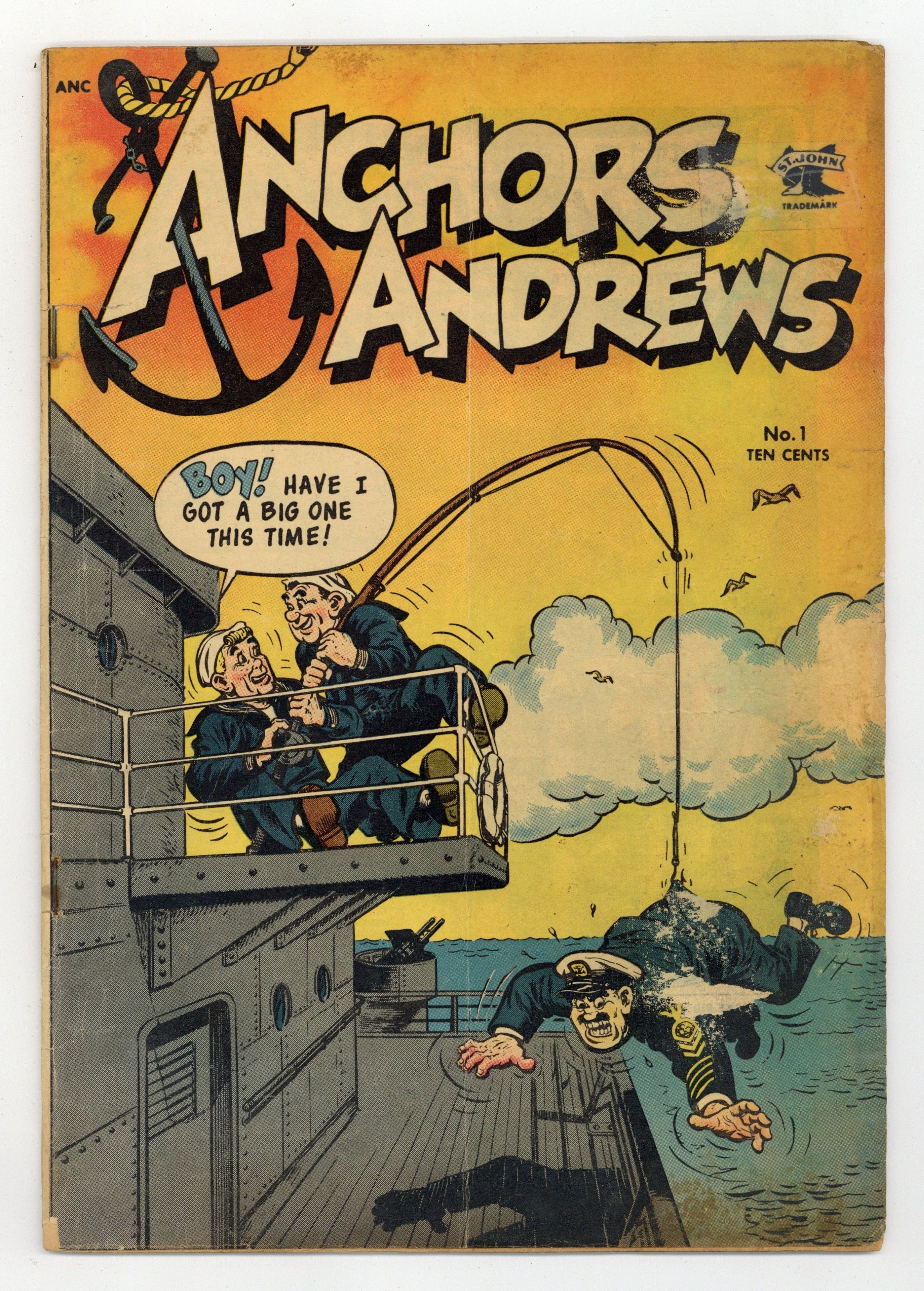 Cover by Carl Hubbell. Stories and art by Matt Baker and Carl Hubbell. Military humor with Anchors Andrews, who looks and acts like Archie's older brother joined the Navy. When Sleepy accidentally loses the pin-up photo of Ofc. Tugglebert's girlfriend, the result is a merry chase across the ship. In a story by good-girl art legend Matt Baker, Canteen Kate fights three approaching North Korean soldiers, armed only with a rolling-pin and moxie. In another Baker story, Canteen Kate's insistence on teaching baseball to a Korean boy results in trouble for her soldier pals. Knavery in the Navy; Canteen Kate; Tale of Two Middies; Canteen Kate: The Old Ball Game; Calling All Ships. 32 pages, Full Color. Cover price $0.10.