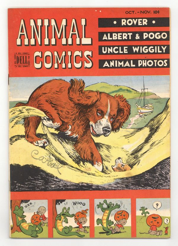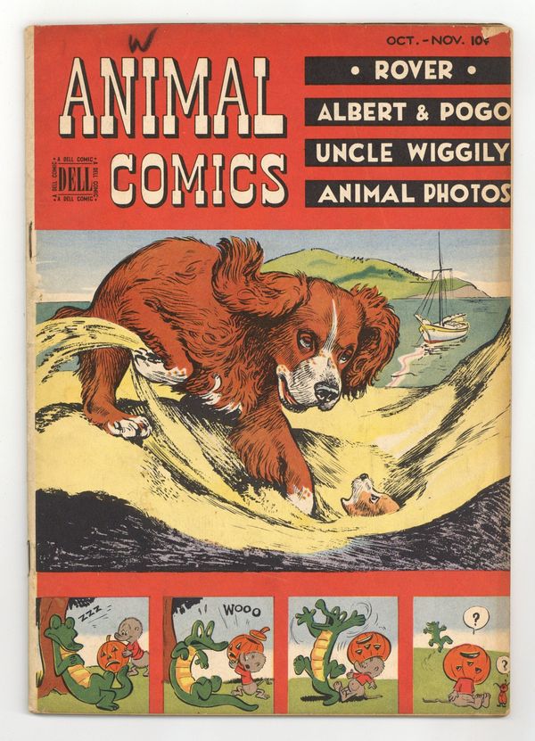 Cover by Walt Kelly and Dan Noonan. Stories and art by Walt Kelly, John Stanley, Hubbell R. McBride, Morris Gollub, Warren W. McSpadden, George E. Clough, Dan Noonan and Gaylord Du Bois (credited as Howard R. Garis). Dell's classic funny-animal series included early work by former Disney animator Walt Kelly, creator of beloved comic strip Pogo. In an early Pogo story by Kelly, Owl wants Pogo to be the assistant in his new knife-throwing act. In another Kelly story, Pogo's fishing pole breaks; luckily, he's still got his tail. Mooch the dog tries to bury a bone, in a story by John Stanley of Little Lulu fame. Rover: The Reunion; Jigg and Mooch; Albert & Pogo; Chuckwagon Charlie; Stop that Bear; Nibble & Nubble; Uncle Wiggily. 48 Pages, Full Color. Cover price $0.10.