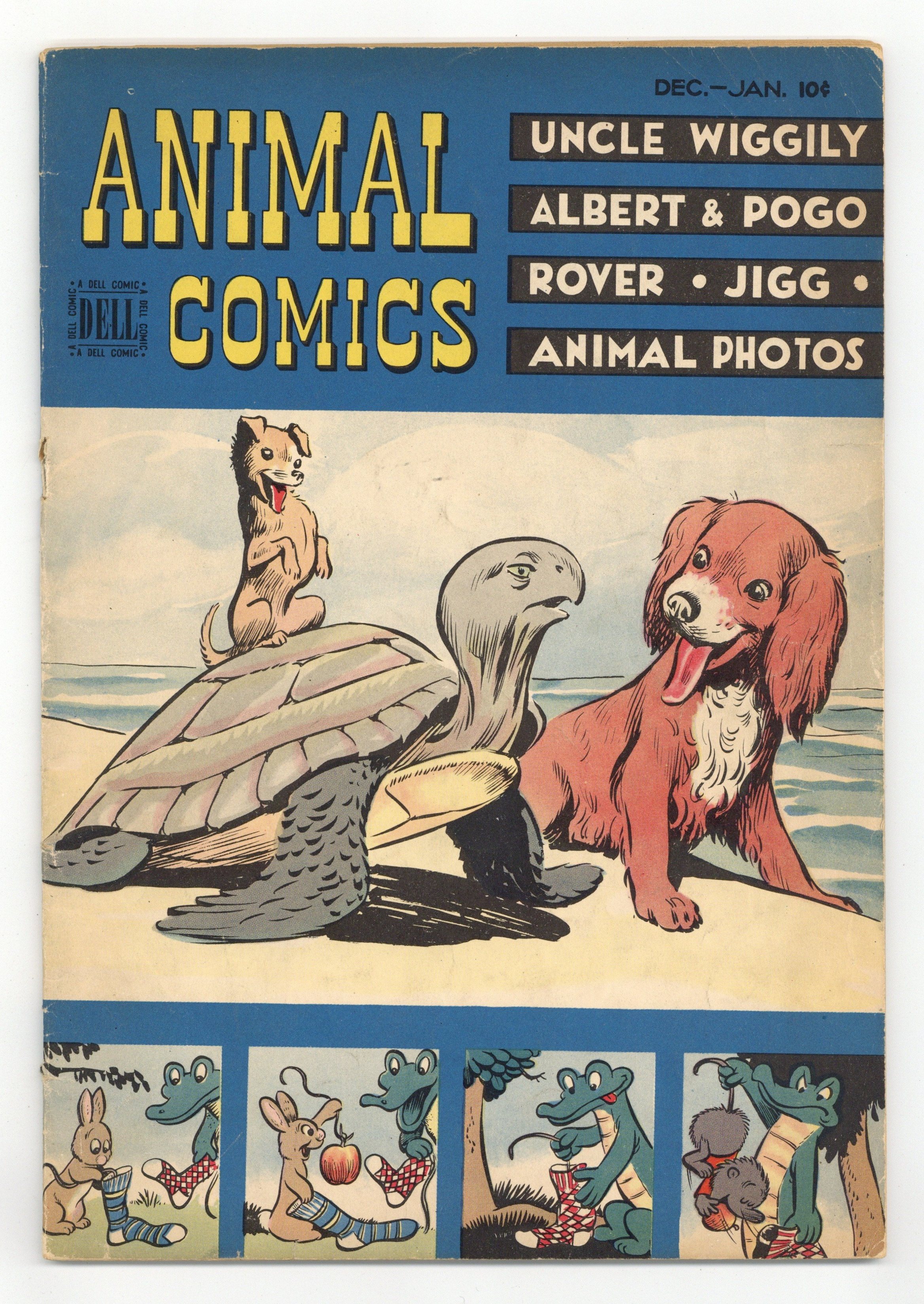 $29.00Cover by Walt Kelly and Dan Noonan. Stories and art by Walt Kelly, John Stanley, Hubbell R. McBride, Morris Gollub, Warren W. McSpadden, Harriet-Smith Hawley, Dan Noonan and Gaylord Du Bois (credited as Howard R. Garis). Dell's classic funny-animal series included early work by former Disney animator Walt Kelly, creator of beloved comic strip Pogo. In an early Pogo story by Kelly, Albert gets gigantic fish Heavy Joe to play along with his fish story. In another Kelly story, Nibble the mouse enlists the parrot to help him escape the house, but they're not ready for air travel. Jigger has to help Mooch escape after he's caught by the dogcatcher, in a story by John Stanley of Little Lulu fame. Rover; Jigg and Mooch; Albert and Pogo; Chuckwagon Charleys Tales; Putnams Cave; Nibble; Uncle Wiggily. Final issue of the series; Kelly continued Pogo's adventures in Pogo Possum (1949-1954 Dell) and the daily newspaper strip. 48 Pages, Full Color. Cover price $0.10.