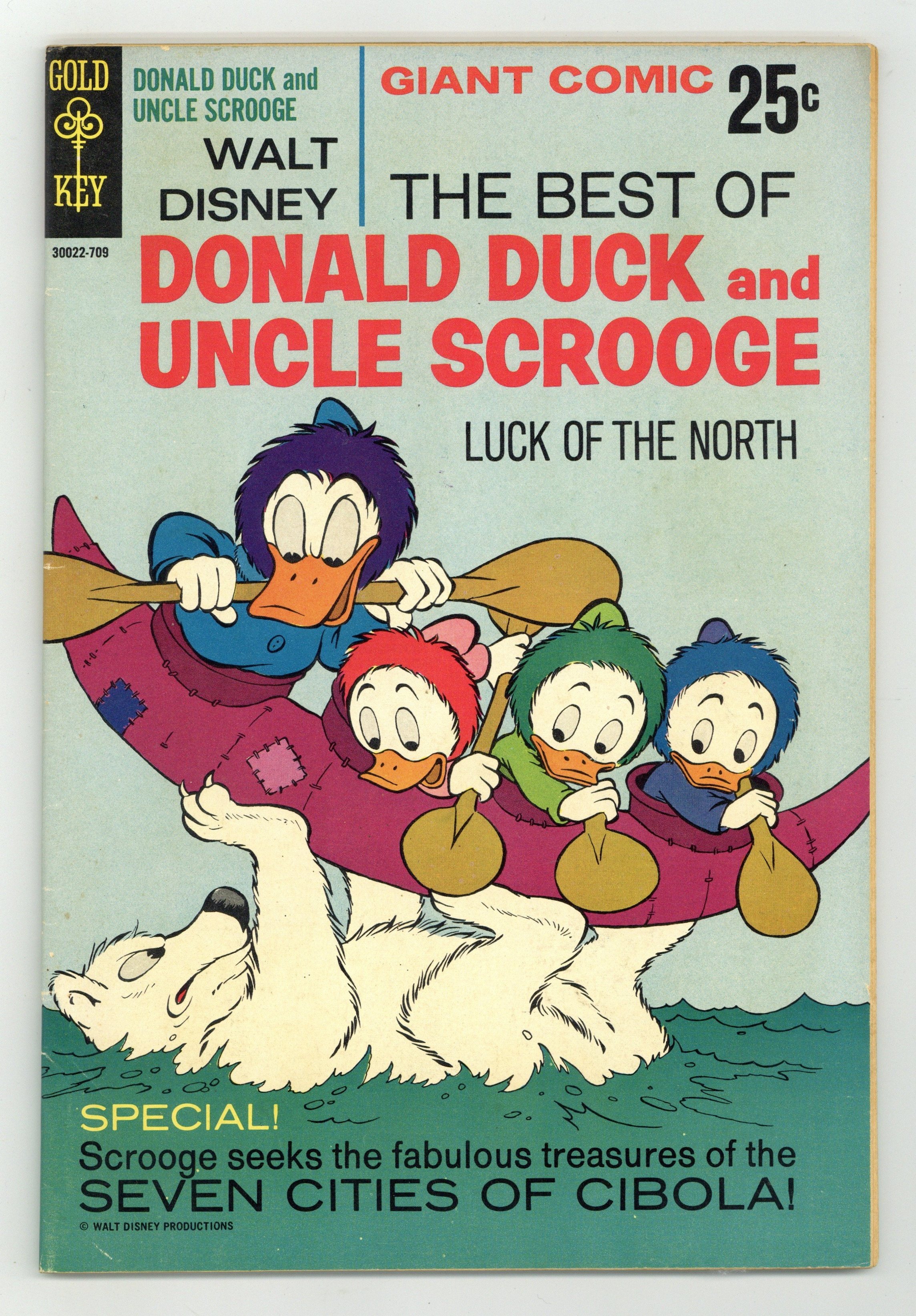 Tags: Disney Ducks & Mice$21.00THE BEST OF DONALD DUCK AND UNCLE SCROOGE (GOLD KEY) #2 No Date 25c Number on cover: 30022-709. Giant size comic reprinting two classic Duck stories by Carl Barks: "Luck of the North" in which Donald, Huey, Dewey, and Louie journey to the Artic Ocean to rescue Gladstone Gander who was sent there as a joke by Donald and "The Seven Cities of Cibola" in which Scrooge, Donald, and the nephews go arrowhead hunting in the desert which leads to a hunt for the legendary Seven Cities of Cibola. Issue also has a four-page story in which Scrooge runs for treasurer and one-page gag strips. Back cover has a pinup of Scrooge. Cover price $0.25.