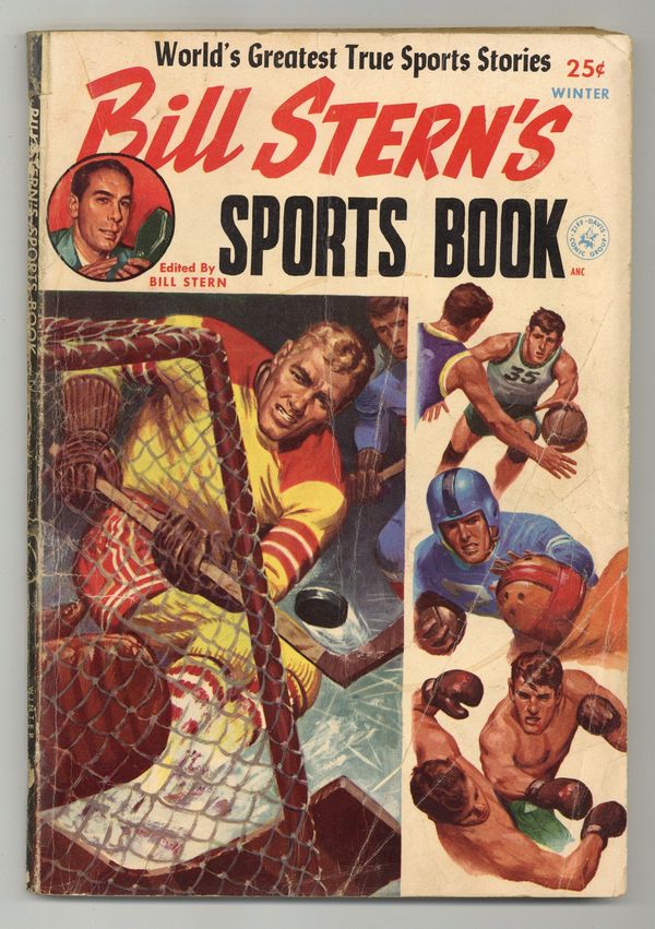"Harlem Globe Trotters--Clown Prince of Basketball" (art by Everett Raymond Kinstler; 12 pages), "A Tale of the Gringo Matadors" (art by Bernard Krigstein, 7 pages), "Mighty Mikan, Mr. Basketball," "The Heart of a Champion" (a boxing story about Harry Greb), "A Pair of Queens" (an ice skating story about Sonja Henie and Barbara Ann Scott), "Wrestling, TV's Pride and Joy," "The Lion Roars" (a story about Lou LIttle's 1933 Columbia football team), "The Man They Call the Rocket, Maurice Richard" (an ice hockey story), "Ray Robinson, 14-Karat Slugger" (a boxing story), "Forty-Nine Gates to Fame" (about Olympic skier Andrea Mead Lawrence), "You Pick the Winner, [Joe] Louis or [Jack] Dempsey in the All-Time Dream Fight" (a boxing story; art by Frank Giacoia), "Mile-a-Minute T.N.T." (about the 1920 Olympic U.S. bobsled team), and "The Pros vs. the Rah Rah Boys" (about Paul Brown's Cleveland Browns 1950 championship game versus the Los Angeles Rams and the 1940 college game between Purdue and Wisconsin), plus a two-page text story, "The Buckeye Bullet" (about Jesse Owens). Painted cover. Cover price $0.10.