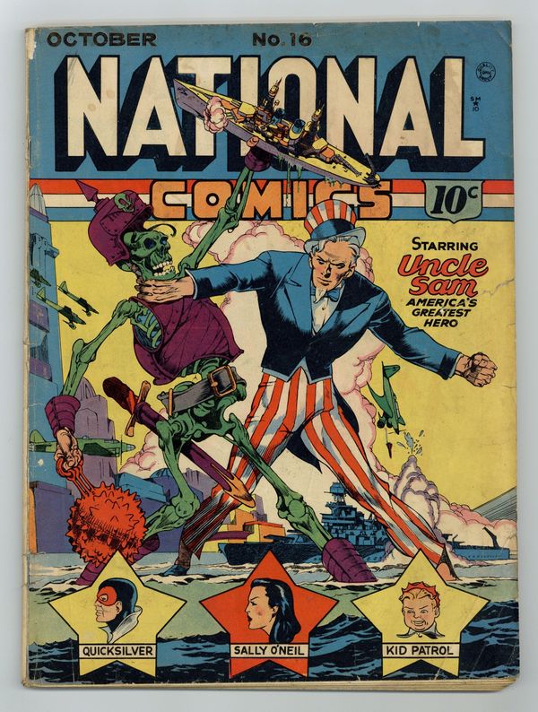 Cover art by Reed Crandall. Untitled stories starring Uncle Sam (script by Will Eisner, art by Lou Fine), Kid Patrol (art by Dan Wilson), Sally O'Neil Policewoman (art by Frank Kearns), Kid Dixon (art by Bob Reynolds), Wonder Boy (art by Nick Cardy), Quicksilver (art by Nick Cardy), Jack and Jill (art by Lowell Riggs), Windy Breeze (art by Jack Cole), Prop Powers (Lynn Bird), Paul Bunyan (art by Story Weaver), Pen Miller (script and art by Klaus Nordling), and Merlin the Magician (art by Fred Guardineer as Lance Blackwood). 68 pgs. $0.10. Cover price $0.10.