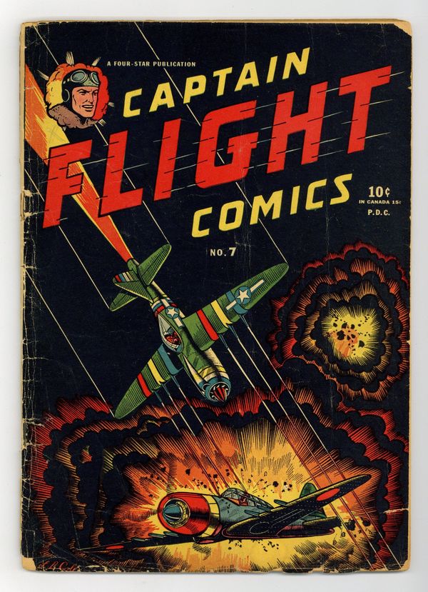 Cover by L. B. Cole. Stories and art by L. B. Cole, Fred Schwab, Murry Tobin and Jerry Koe. Aviator hero Captain Flight battles the Axis by air during World War II. Captain Flight battles a plot to invade America by first laying siege to New York. Red Rocket investigates the destruction of Mexican oil fields. Government diver Deep-Sea Dawson is aided on an assignment by a trained seal he freed from its cruel master. Captain Flight; "Little Off" Fanny; Red Rocket; Slug McGee; Flight Heroes; Rock Raymond; Korner Kids; Zaan of the Jungle: The Weird Ape Howls!; Deep-Sea Dawson; Toppy. 52 pages, Full Color. Cover price $0.10.