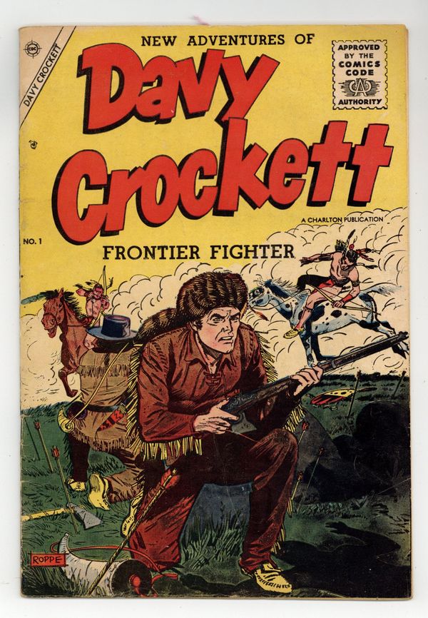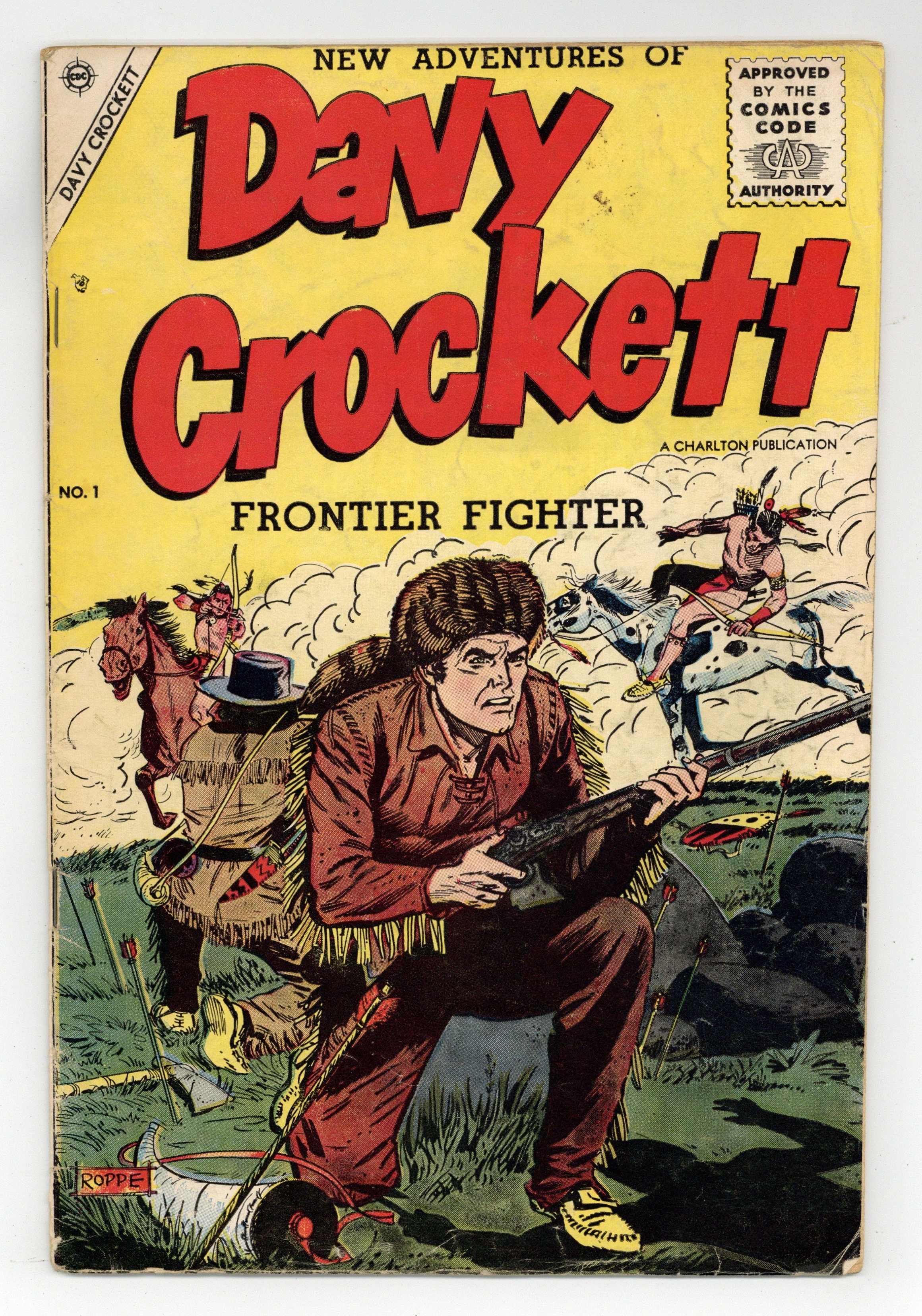 Published Aug 1955 by Charlton Comics Group.$25.00Cover by Mike Roy and Mike Peppe. Stories and art by Mike Roy, Mike Peppe, Charles Nicholas, and Vince Alascia. Cashing in on the 1950s Davy Crockett craze that followed Disney's popular TV series, Charlton presents its own adventures of the legendary frontiersman. Davy must help Andrew Jackson's troops when they are surrounded by Creek warriors. 14-year-old Davy encounters a nomadic tribe at Gideons Creek. Plus a comics biography of John Chapman, better known as Johnny Appleseed. Indian Attack; The Fight on Gideons Creek; Red Roan: Lobo Terror; Big Bow and Little Arrow: The Paper Picker; Davy Crockett Casts His Vote; The Story of Johnny Appleseed. 32 pages, Full Color. Cover price $0.10.