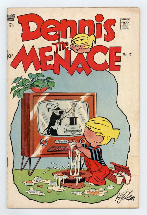Published Sep 1955 by Standard/Pines/Haliden.$27.00Cover art by Hank Ketcham. Reprints of daily Dennis the Menace cartoons by Ketcham. It's Magic starring Dennis the Menace, script by Fred Toole, art by Al Wiseman. Mind Over Manners starring Dennis the Menace, script by Fred Toole, art by Al Wiseman. This Is Art? starring Dennis the Menace, script by Fred Toole, art by Al Wiseman. Here's a Page for Your to Color! activity page. Mike Pitches In text story. Screamy Mimi; Mimi and her mom visit Aunt Helen. Deddis duh Medace vs. the Drug Store starring Dennis the Menace, script by Fred Toole, art by Al Wiseman. Get a free Dennis the Menace coloring book when you buy a Dr. West's toothbrush ad. 36 pgs. $0.10. Cover price $0.10.