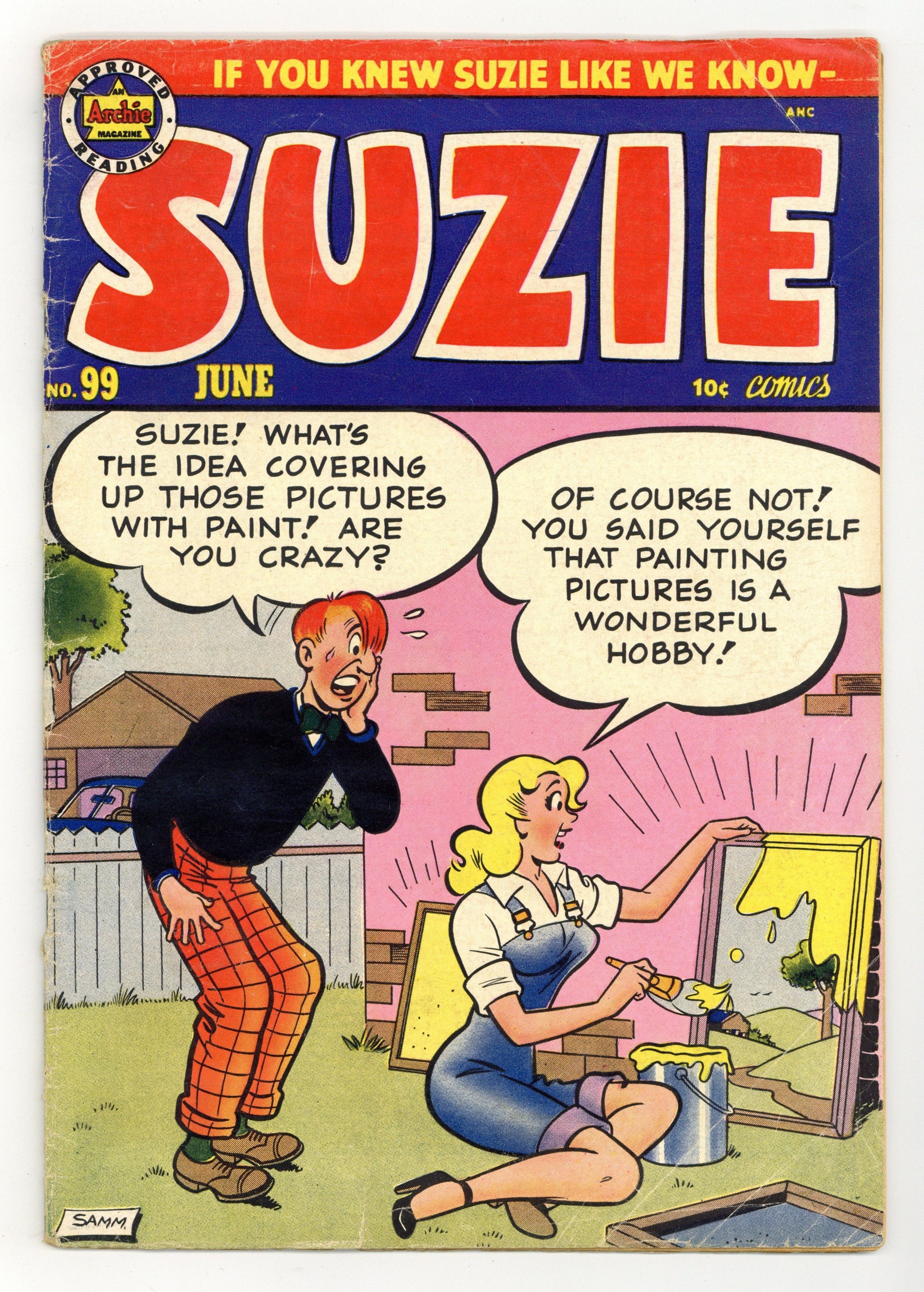 Cover by Samm Schwartz. "Fire Away," art by Samm Schwartz; Suzie makes her hot chocolate a little too hot for Ferdie to handle. "Three O'Clock Jump"; Ferdie gets some pretty stringent advice from his physician. "Beach Peach," pencils by Samm Schwartz; Suzie finds a unique way of attracting male attention at the beach. "Ring Master," pencils by Samm Schwartz; Suzie buys the contract of a punching bag prize-fighter. "Hat To Hat Chat"; Suzie makes herself a new hat, but accidentally gets it switched with a lampshade. "Tee For Three"; Suzie takes up golf and her practicing may be hazardous to her father's health. "Katy the Jungle Goddess," script and pencils by Bill Woggon, inks by Hazel Marten and Kathryn Bill; Katy Keenes agent gets her a part in a jungle film with matinee idol Errol Swoon. "The Good Old Daze"; Suzie's strict, old-fashioned grandmother is cramping Ferdie's style. 36 pgs., full color. Cover price $0.10.