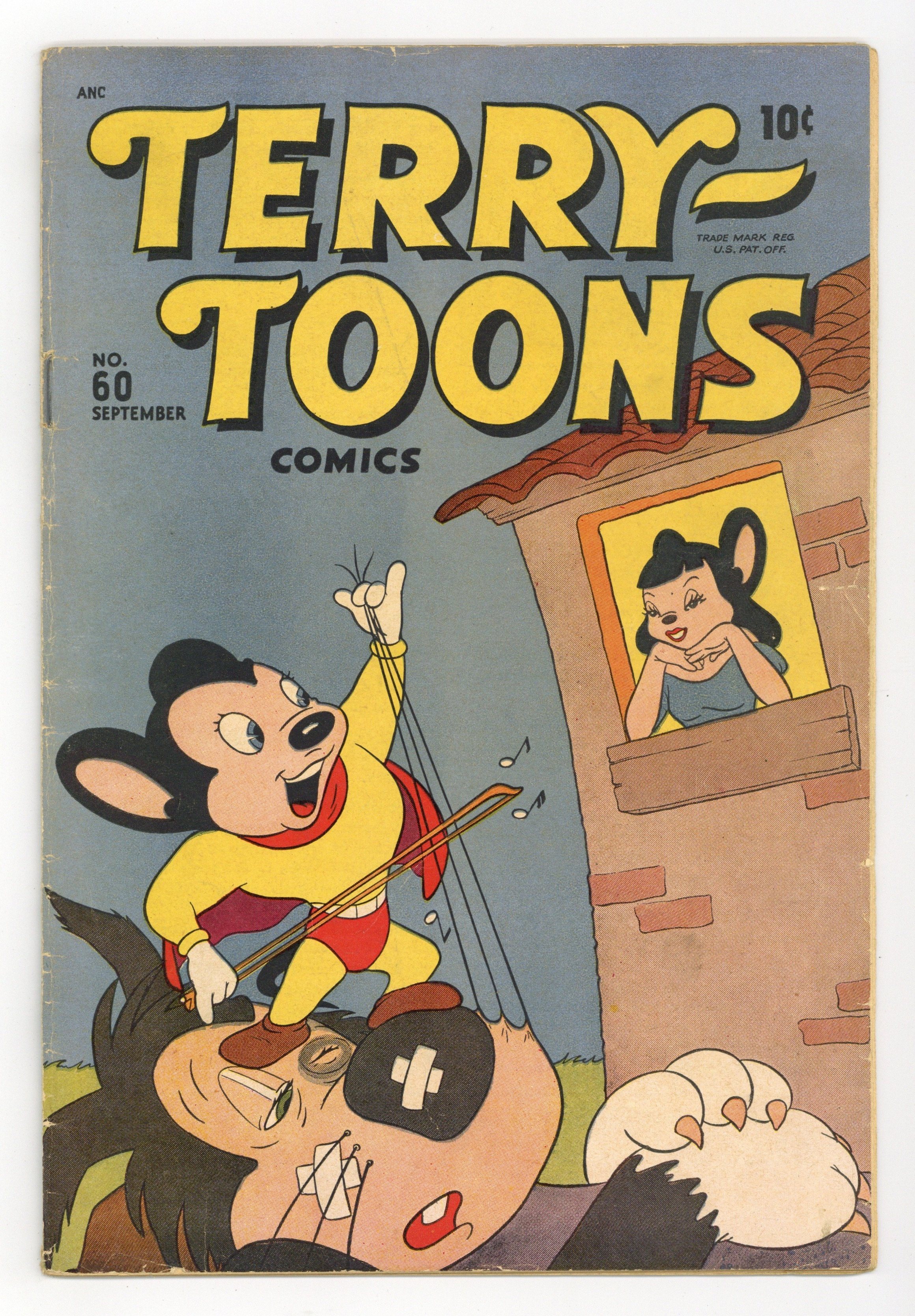 St. John takes over publishing the comics adventures of the characters of animator Paul Terry's studio. The Claw uses a Mighty Mouse impersonator to frame MM for his crimes, so his gang will have free rein of the city while the Mouse of Steel is in jail. Heckle and Jeckle protect a newly-hatched baby bird, not realizing it's a vulture. A wolf plans a "surprise party" for Mighty Mouse that is just a trap for the mice; luckily, Mighty Mouse crashes his own party. Dinky Is Grounded; Mighty Mouse Meets the Claw; Heckle and Jeckle: Minding the Baby; Gandy Goose: Hidden Talent; Mighty Mouse: The Surprise Party; Puzzle Page. 32 pages, Full Color. Cover price $0.10.