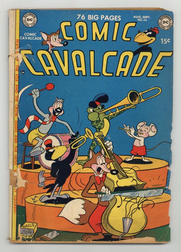F. Fox's Treasure Expedition starring Fox And Crow. Happy Birthday, Jimmie! starring Blabber Mouse, art by Rube Grossman. Did You Ever Get Real Tired of Your Friends? starring Bo Bunny, script and art by Sheldon Mayer; Bo gets sick of being a comic character and moves to the real world. Out to Seagull Island to Hunt For Pirate Treasure starring Raccoon Kids, art by Otto Feuer. ["A few puffs of smoke into this old can and Presto! I'm in business!"] starring The Dodo and the Frog, art by Otto Feuer. Say, Doodles Can I Borrow Your Hammer? starring Doodles Duck, script and art by Sheldon Mayer. Aaah -- Peace and Quiet! How I Love It" starring J. Rufus Lion. ["I like flowers! I don't like Carrots!"] starring Tortoise and the Hare, art by Rube Grossman. Pierre Van Hare World's Greatest Artist starring Goofy Goose, art by Rube Grossman. My Wife Ordered a Beach Chair! starring Nutsy Squirrel, art by Rube Grossman. 8 Walt Disney Comic Books Wheaties ad. 76 Pages, Full Color. Cover price $0.15.