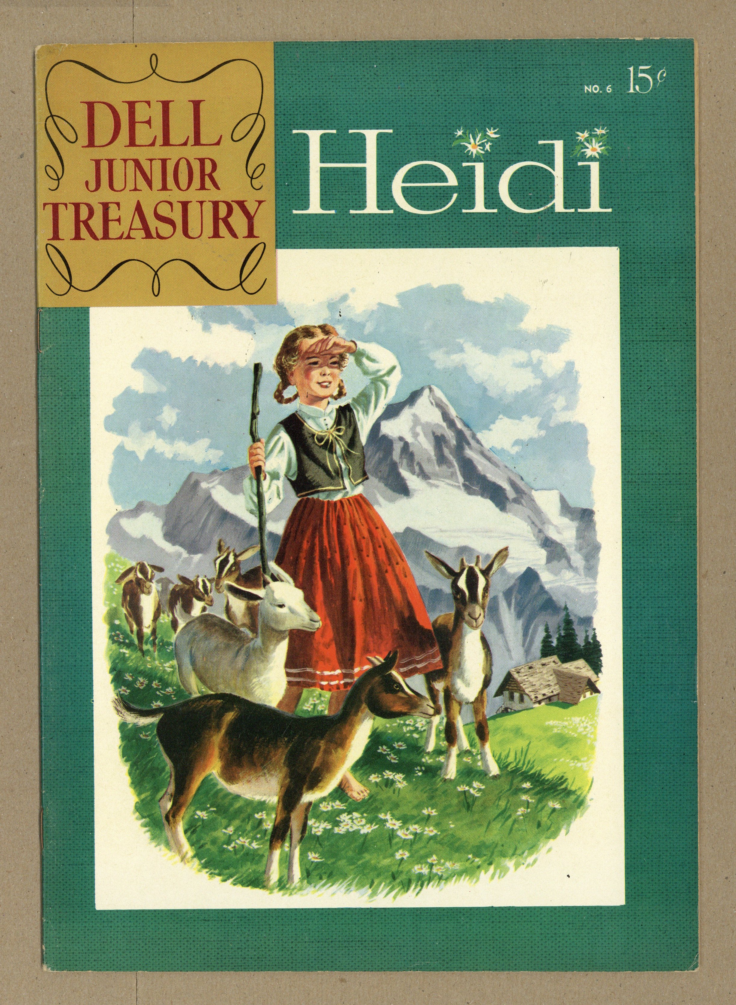 Heidi. Cover by Mel Crawford. Stories and art by Mel Crawford and Gaylord Du Bois. Dell Junior Treasury presented classic childrens literature in an elegant form, geared toward parental approval. This issue features a comic book adaptation of the classic novel Heidi. Plus a brief biography of Johanna Spyri, author of Heidi, and a map of places in the story. Heidi; The Goatherds Song; The Goat That Stayed Behind; Scenes of Heidis Adventures. 32 pages, Full Color. Cover price $0.15.