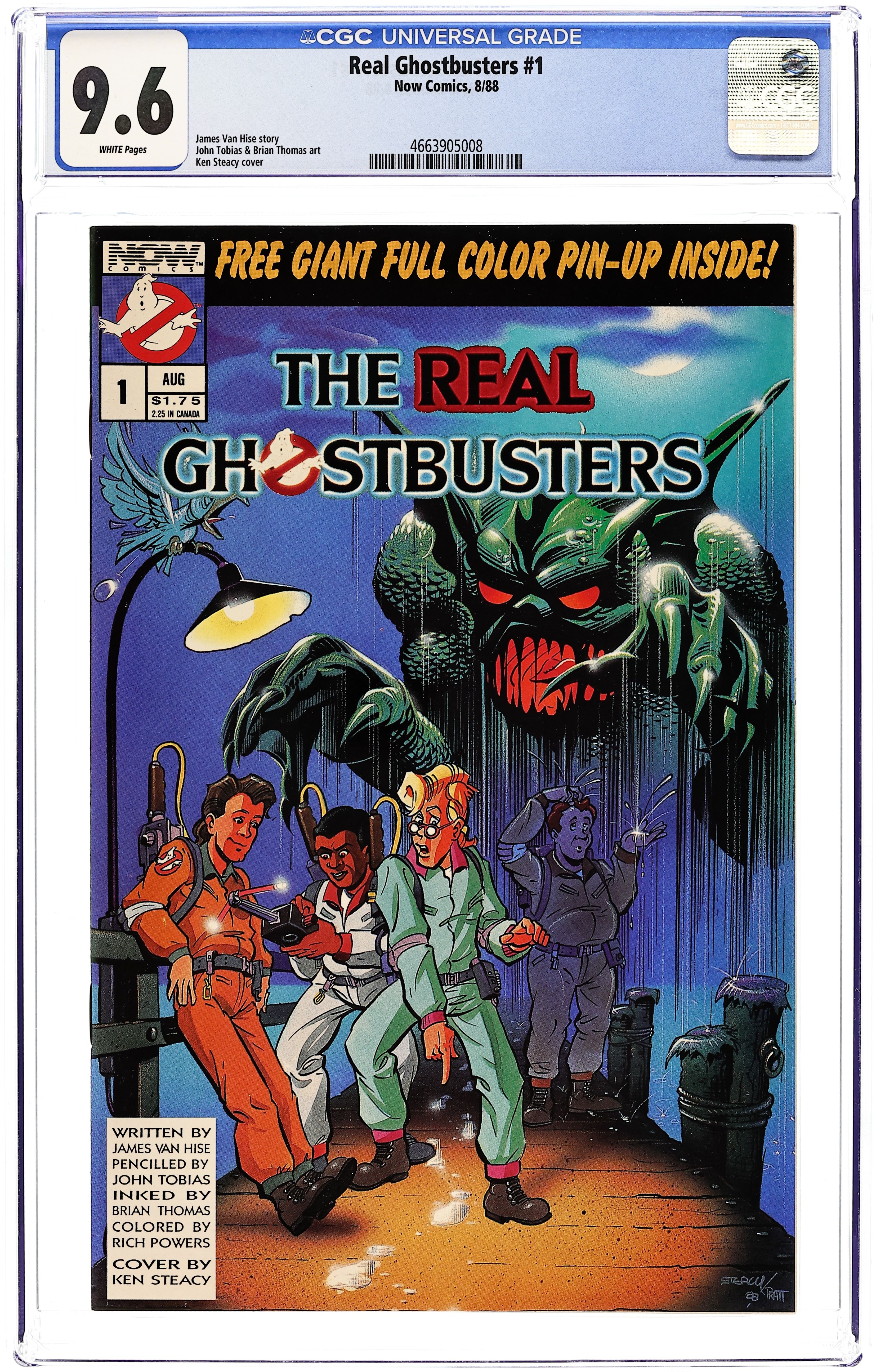 Direct Edition. Story by James Van Hise. Art by John Tobias. Cover by Andrew Pratt and Ken Steacy. The official comic adaptation of the popular 1980s cartoon series, inspired in turn by the hit movies. While trying to trap the ghost of Captain Nemo, time travelers send the Ghostbusters into nightmare worlds featuring monsters, a werewolf school, and aliens. 32 pages, Full Color. Cover price $1.75.