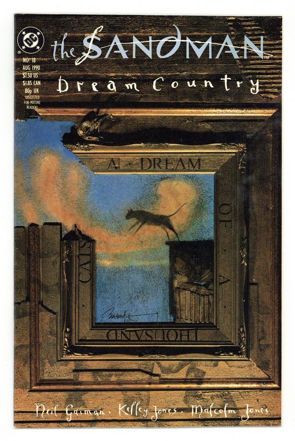 Published Aug 1990 by DC/Vertigo.$19.00Dream Country, Part 2 of 4: "A Dream of a Thousand Cats." The Dream Country saga continues, featuring pencils by Kelley Jones! Written by Neil Gaiman, with art by Jones and Malcolm Jones III. Painted cover by Dave McKean. Suggested for Mature Readers. New Format. Cover price $1.50.