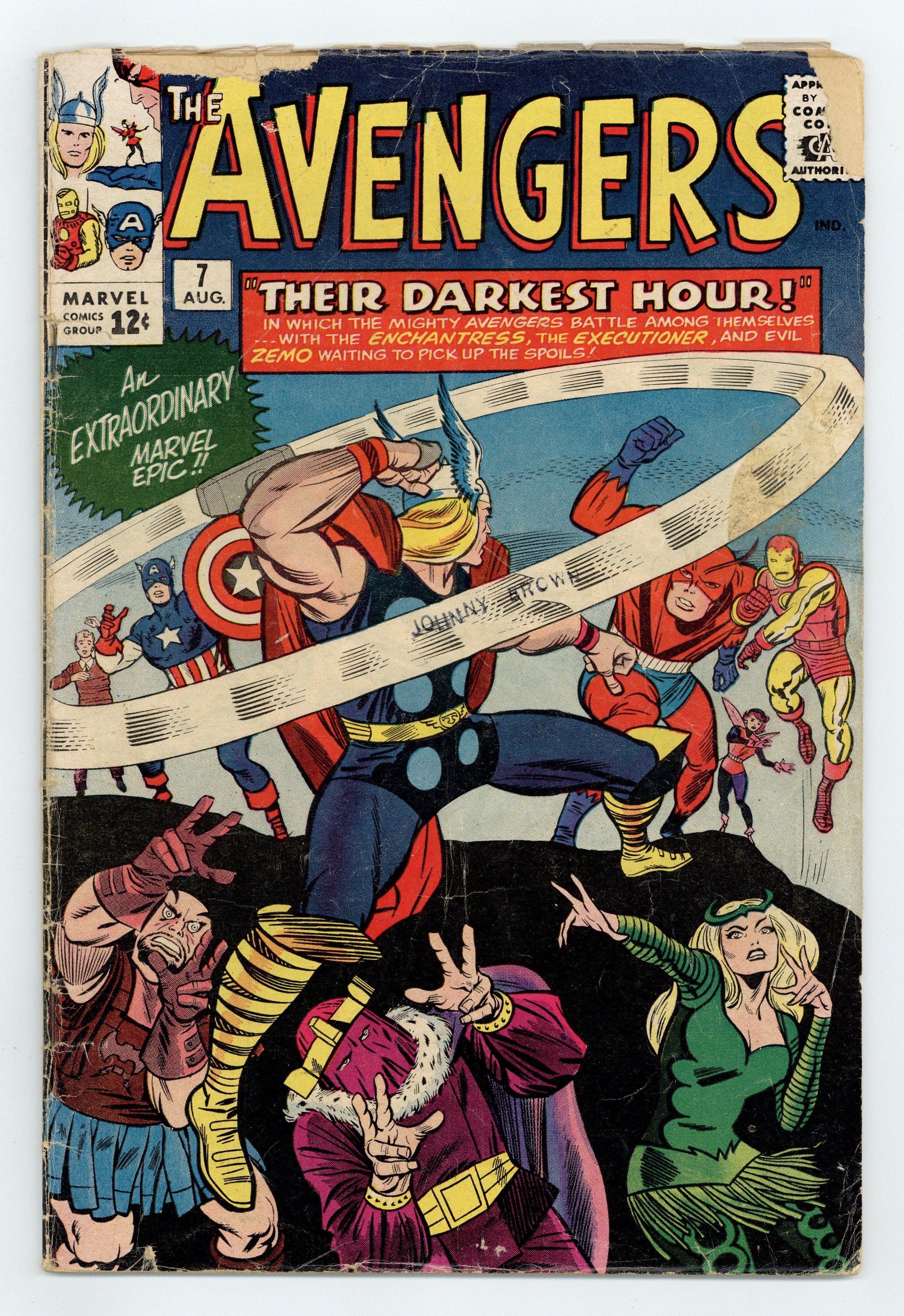 Cover pencils by Jack Kirby, inks by Chic Stone. Rick Jones dons Bucky's costume in "Their Darkest Hour!", script by Stan Lee, pencils by Jack Kirby, inks by Chic Stone; In Asgard, the Enchantress and the Executioner are banished to Earth by Odin; There they find Zemo (who had managed to escape the authorities) and they team up with him to stop Captain America; The Enchantress' motive is to get Thor by her side; She successfully lures Thor and hypnotizes him to fight for them; Meanwhile Captain America travels to the Amazon jungle to capture Zemo; Captain America then wins against Zemo's forces and Zemo tries to escape; Captain America grabs onto to the escape ship, however; The other Avengers fight Thor and, thanks to Iron Man, bring him back to his senses; Zemo's ship flies to the Avengers battle to rescue the Executioner and the Enchantress. Roster includes Thor, Iron Man, Giant-Man, Wasp, and Captain America. 36 pgs., full color. $0.12. Cover price $0.12.
