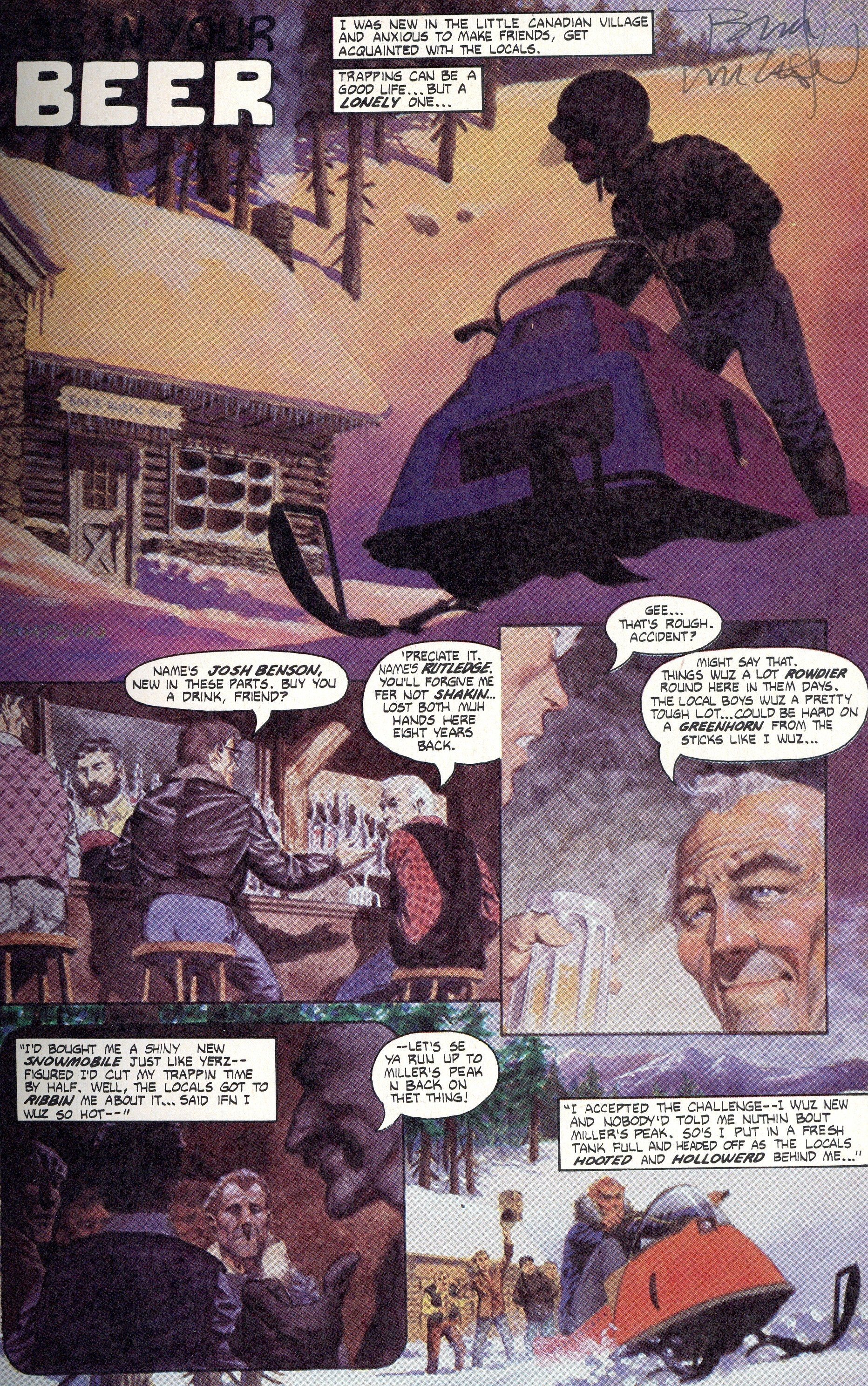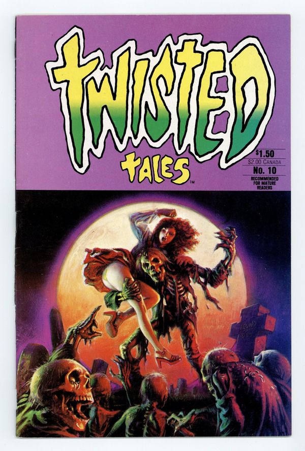 Stories by Bruce Jones, David Carren and Rick Geary. Art by Attilio Micheluzzi, Bernie Wrightson, Gray Morrow, Bill Wray, and Rick Geary. Painted cover by John Pound. A horror anthology from the mind of writer Bruce Jones, featuring art by some of the top illustrators of the time. The newcomer in a Canadian village learns the truth about Sasquatch, in a story with art by Swamp Thing creator Bernie Wrightson. Two tales of ironic justice reveal why a bear suit makes a bad choice for crime. A time traveler wants to witness the Lizzie Borden murders, but gets a little too close, in a story by comics legend Gray Morrow. Egg In Your Beer; One for the Money… Two for the Show; Hatchet Job; If She Dies; Poison in the Pantry. Final issue of the series; followed by Twisted Tales of Bruce Jones (1986) #1. 32 pages, Full Color. Mature readers. Cover price $1.50.