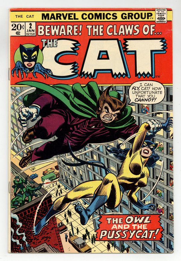 The Owl and the Pussycat!! - Written by Linda Fite. Art by Marie Severin and Jim Mooney. Cover by John Romita, Sr. The Cat takes on The Owl! Characters in this issue: The Cat [Greer Grant Nelson]; The Owl; Broussard [also as Arthur Tumolo] (introduction); Dr. Joanne Tumolo; Mal Donalbain (flashback); Bill Nelson (flashback); The Cat [Shirlee Bryant] (flashback); Zabo (flashback); Ben Richards. 32 pages, full color. Cover price $0.20.