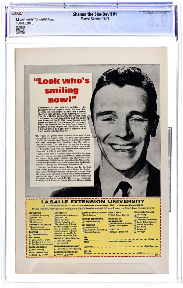 $75.00Cover art by Jim Steranko. "Shanna the She-Devil!", script by Carole Seuling and Steve Gerber, pencils by George Tuska, inks by Vince Colletta; The origin of Shanna; Shanna O'Hara Plunder is the daughter of a diamond miner; Born in Africa, she spent her childhood in the jungles of Zaire; After Shanna's father accidentally kills her mother, Shanna moves back to the United States to live with relatives, and Shanna grows up to become an accomplished athlete and then becomes a zoologist; She returns to Africa and patrols the jungle living freely with the land. 36 pgs., full color. Cover price $0.20.