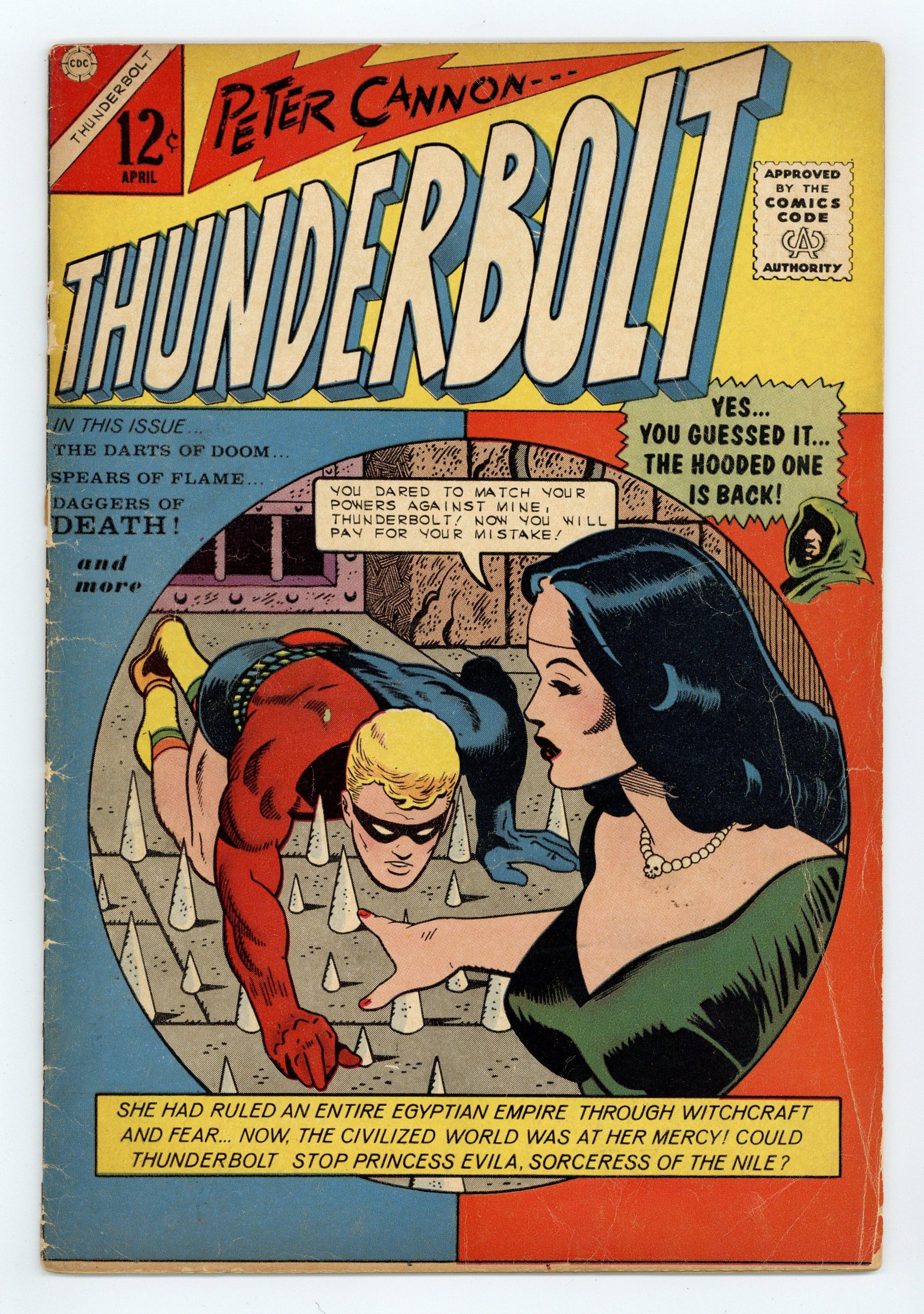 Cover by Pete Morisi. Stories and art by Pete Morisi, Bill Fraccio and Tony Tallarico. Numbering continues from Son of Vulcan (1966 Charlton) #50. Trained from birth by Tibetan monks to attain physical and mental perfection, Peter Cannon becomes Thunderbolt, one of Charlton's most significant contributions to the superhero genre. The Hooded One revives ancient Egyptian sorceress Evila, who has deathtraps for Thunderbolt and mind-control spells for the rest of the world. The Evil That Is Evila; Physalia physalis; The Atmosphere. 32 pages, Full Color. Cover price $0.12.