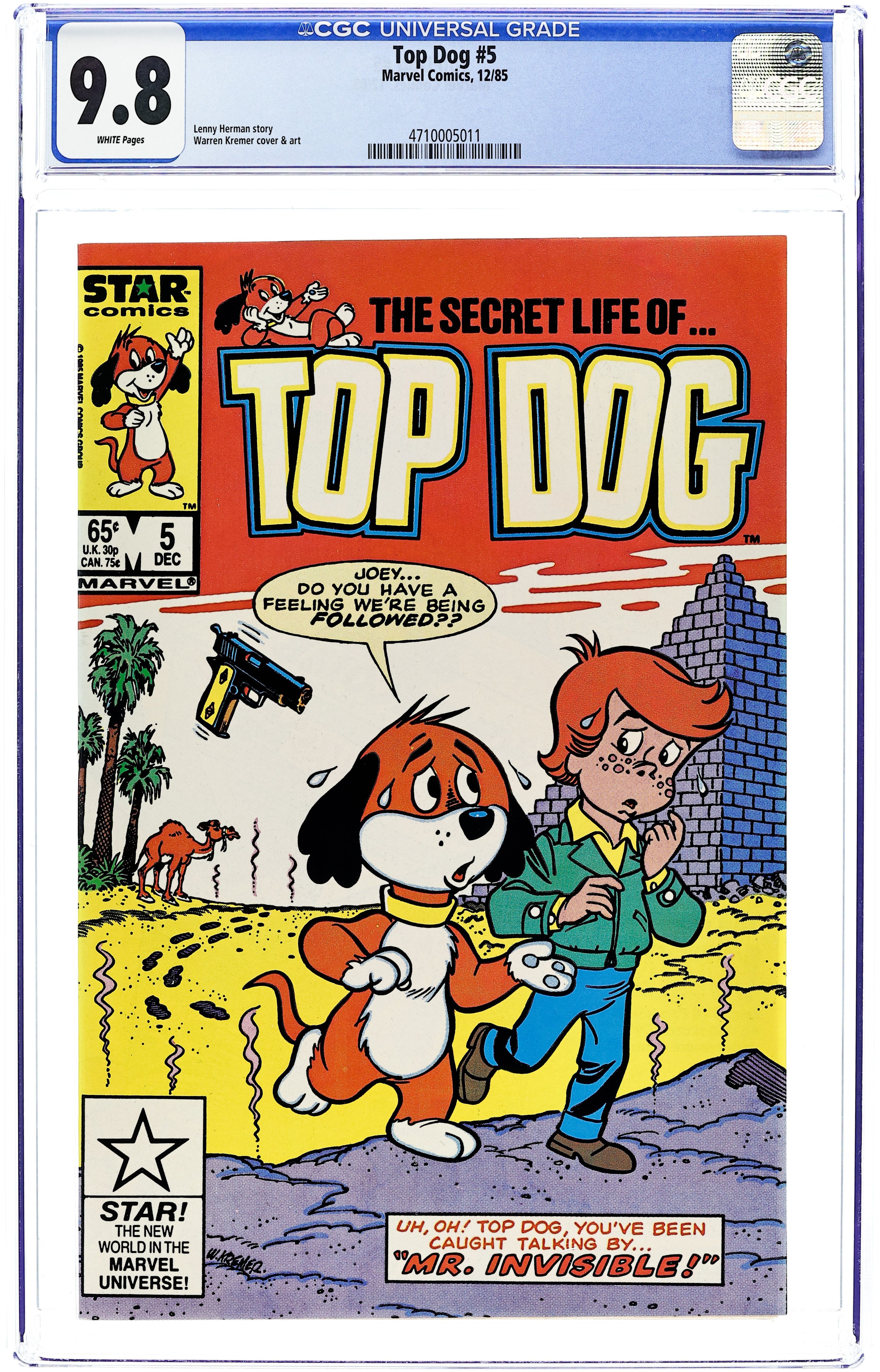 Top Dog and Joey continue the secret work for the government and have to find a way to stop a foe who is invisible. And in order to do that, they have to obtain a pearl hidden in an Egyptian pyramid in "King Invisible," "Race for the Pearl" and "The Final Confrontation." Scripts by Lennie Herman and art by Warren Kremer. $0.65. Cover price $0.65.