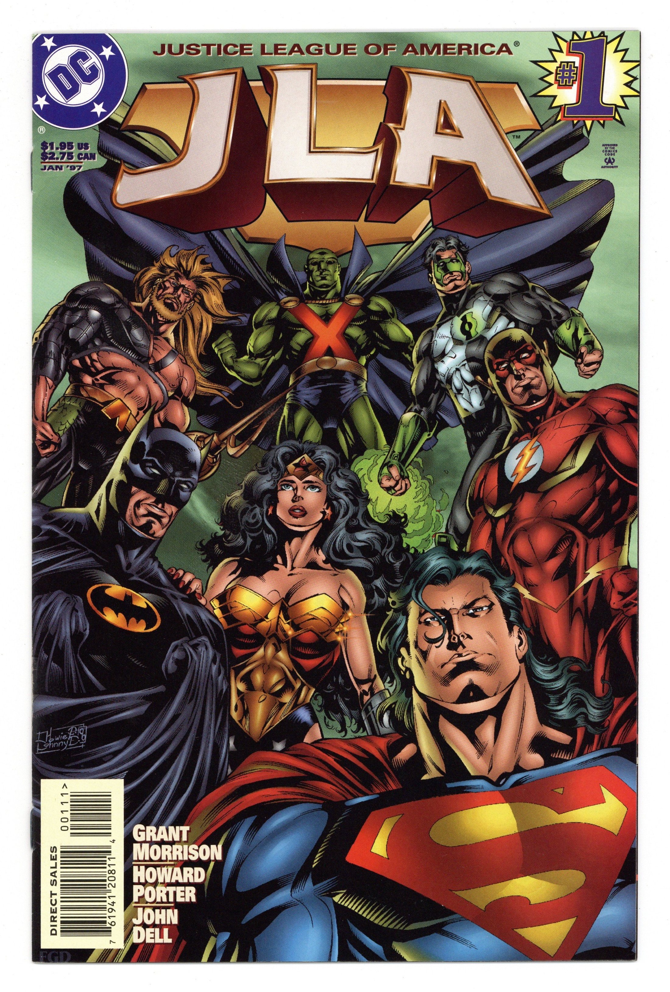 Tags: Justice League/Society$10.00The Hyperclan's arrival on Earth is met with praise by the public, but distrust by Superman, Wonder Woman, Batman, Martian Manhunter, Green Lantern and Flash, while Metamorpho tries to protect Nuklon, Ice Maiden and Obsidian in "Them!" Part 1 of 4, continued next issue. Script by Grant Morrison, pencils by Howard Porter, inks by John Dell. Porter/Dell cover. Cover price $1.95.