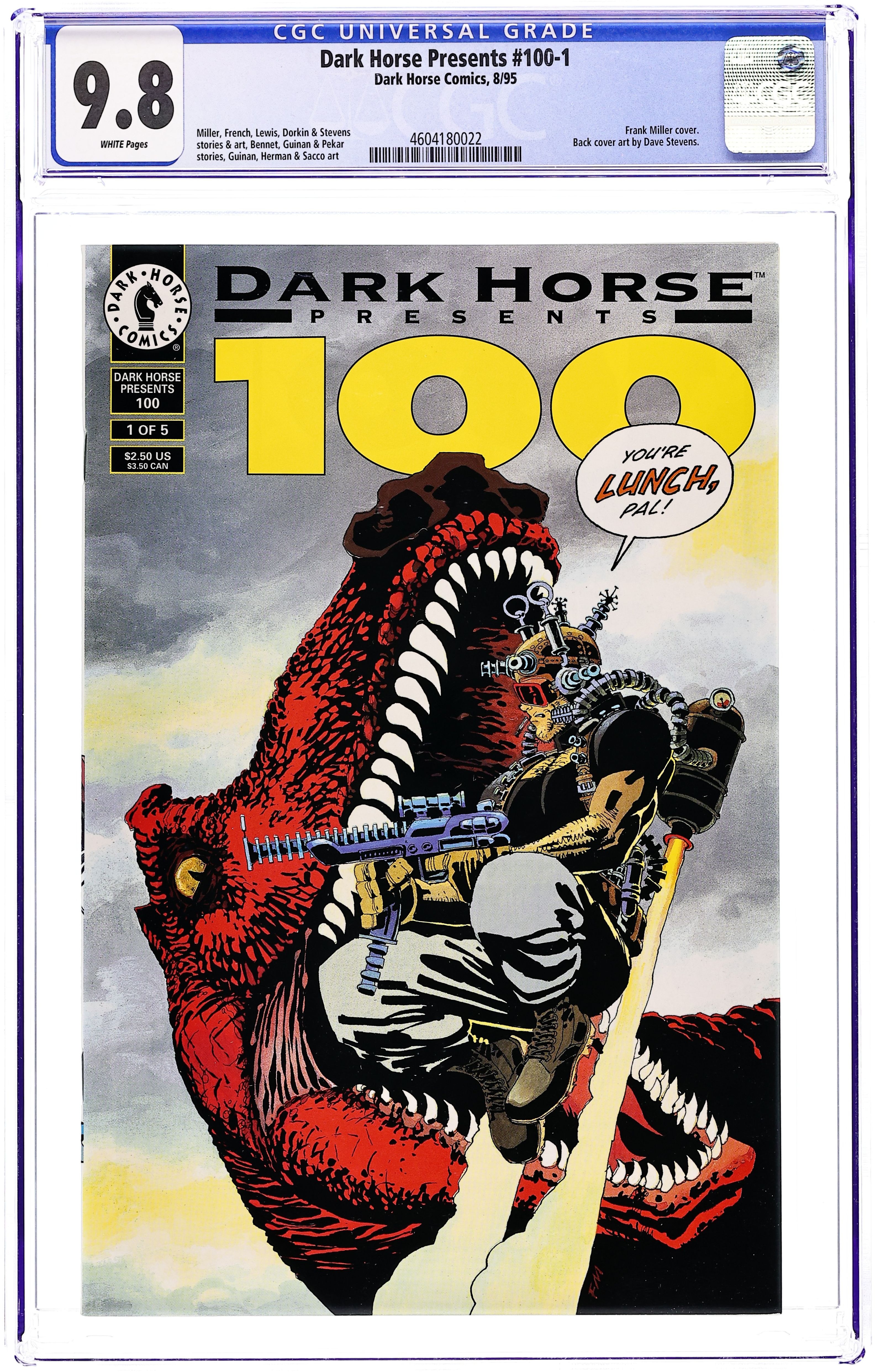 Part 1 of 5 - Cover by Frank Miller. NOTE: There are 6 different versions of #100. They are numbered from 0 to 5 and are all different stories. The numbers are represented by the letter at the end of the issue number. For our fifth anniversary, Frank Miller introduced Sin City -- be here for his next hit. B&W. Cover price $2.50.
