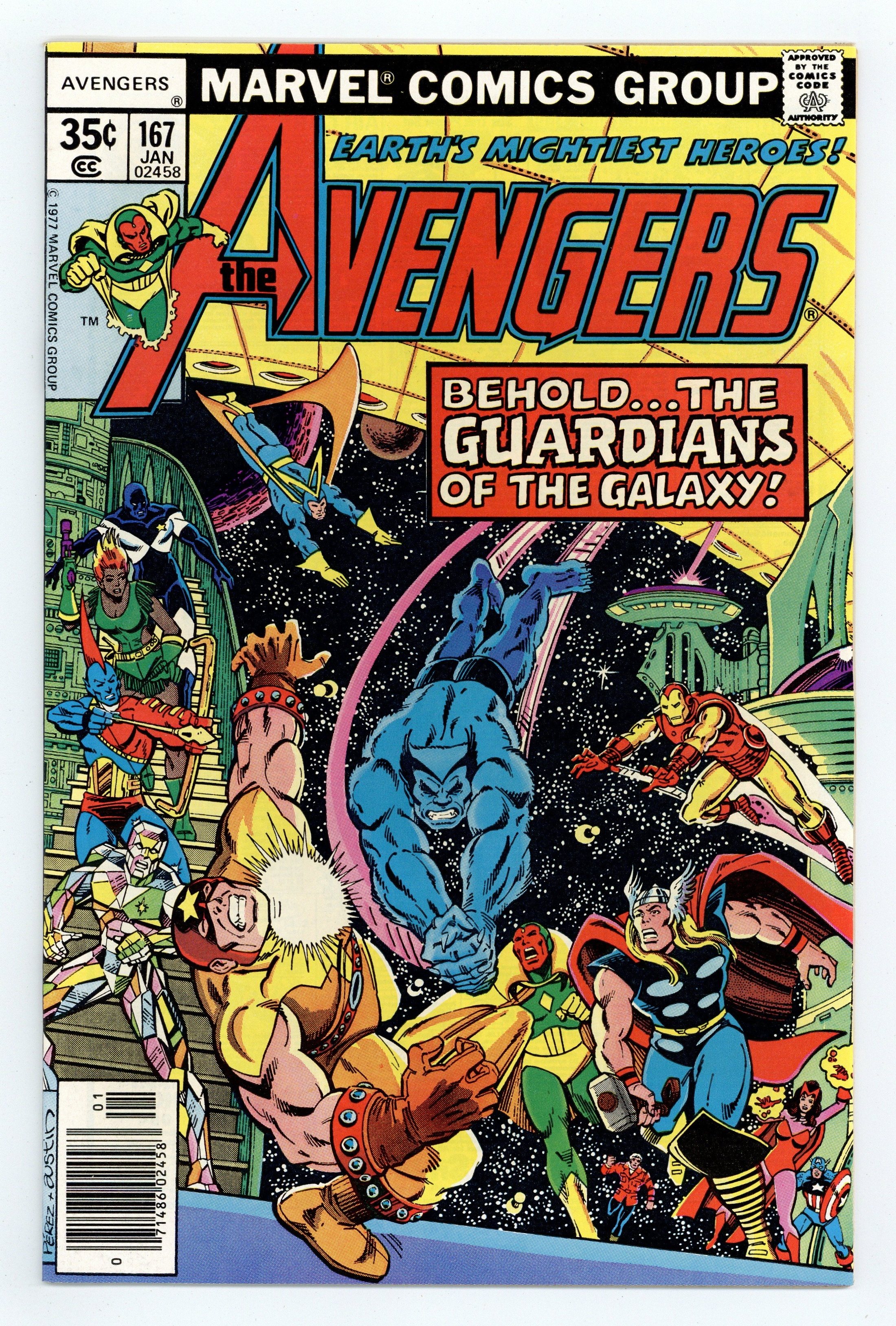The Korvac Saga: Part 1 of 10 - "Tomorrow Dies Today!" Guest-starring the Guardians of the Galaxy. Script by Jim Shooter. Pencils by George Perez. Inks by Pablo Marcos. Cover by George Perez and Terry Austin. The Korvac Saga begins! A sensational storyline that sends Earth's Mightiest Heroes on a ten-issue odyssey to save the universe! The epic adventure begins with a simple distress call from Nick Fury. An enormous spaceship is orbiting the Earth! Where did it come from and who does it belong to? The Avengers blast off in a quinjet to find out! After boarding the giant ship, the Beast bumps into the Guardians of the Galaxy! Why have Charlie-27, Martinex, Nikki, Starhawk, Vance Astro, and Yondu come to the 20th century? It's a long story, that's only just beginning! Meanwhile back in New York City, the Wasp's first fashion show is interrupted by the Porcupine! Fortunately, Nighthawk and Yellowjacket are in attendance to fight the prickly villain! But someone else is present too...a mysterious man named Michael. More will be heard from him later...much more. Avengers Lineup: Beast, Captain America, Iron Man, Scarlet Witch, Thor, Vision, Wasp, Wonder Man, and Yellowjacket. (Notes: Korvac previously appeared in Thor Annual 6. The 10-issue Korvac Saga takes place in Avengers 167-168 and 170-177. Roger Stern is also credited with scripting this issue.) 36 pgs. Cover price $0.35.