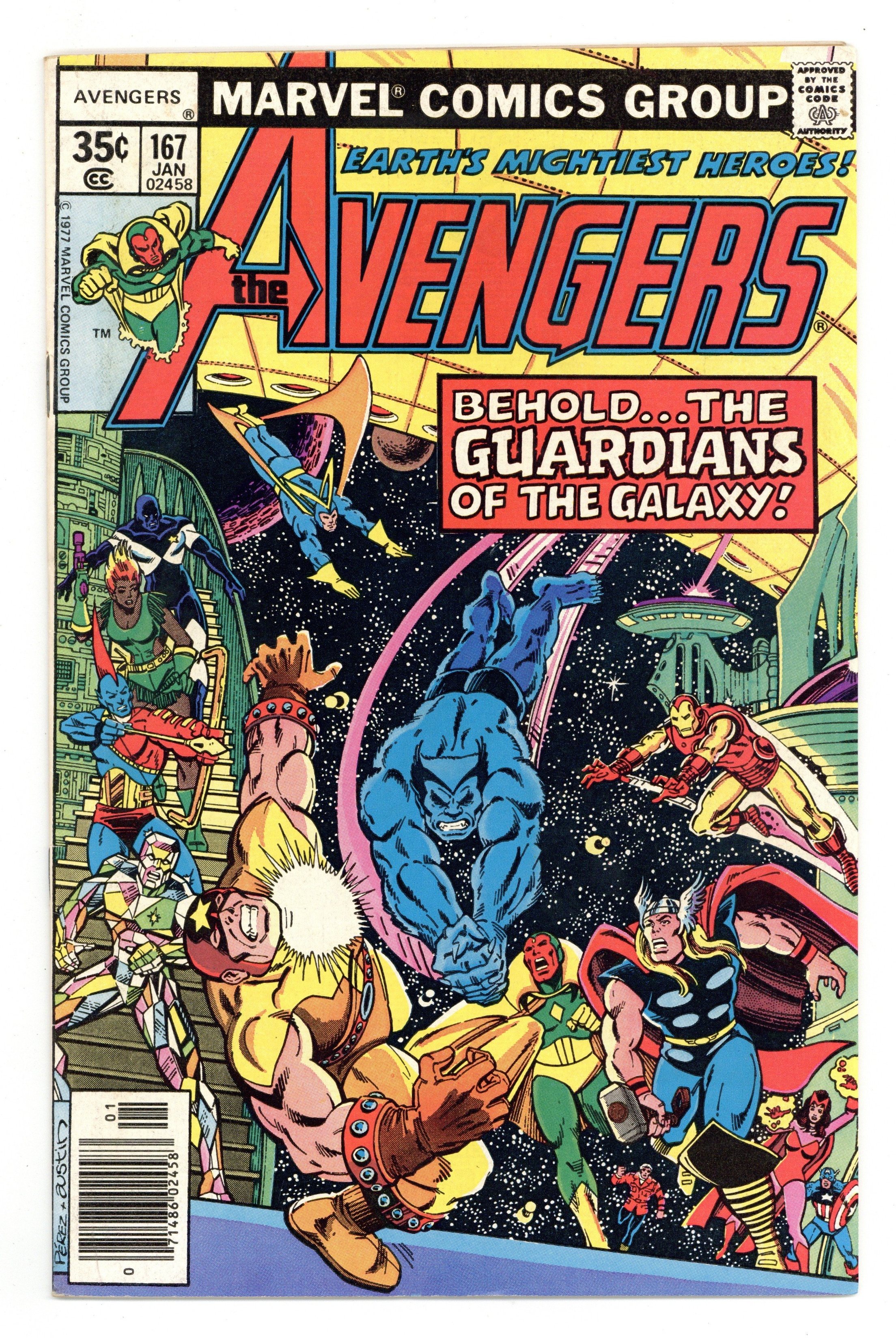 Tags: Avengers The Korvac Saga (part 1), Marvel Legacy Numbering: Avengers (part 167)$15.00The Korvac Saga: Part 1 of 10 - "Tomorrow Dies Today!" Guest-starring the Guardians of the Galaxy. Script by Jim Shooter. Pencils by George Perez. Inks by Pablo Marcos. Cover by George Perez and Terry Austin. The Korvac Saga begins! A sensational storyline that sends Earth's Mightiest Heroes on a ten-issue odyssey to save the universe! The epic adventure begins with a simple distress call from Nick Fury. An enormous spaceship is orbiting the Earth! Where did it come from and who does it belong to? The Avengers blast off in a quinjet to find out! After boarding the giant ship, the Beast bumps into the Guardians of the Galaxy! Why have Charlie-27, Martinex, Nikki, Starhawk, Vance Astro, and Yondu come to the 20th century? It's a long story, that's only just beginning! Meanwhile back in New York City, the Wasp's first fashion show is interrupted by the Porcupine! Fortunately, Nighthawk and Yellowjacket are in attendance to fight the prickly villain! But someone else is present too...a mysterious man named Michael. More will be heard from him later...much more. Avengers Lineup: Beast, Captain America, Iron Man, Scarlet Witch, Thor, Vision, Wasp, Wonder Man, and Yellowjacket. (Notes: Korvac previously appeared in Thor Annual 6. The 10-issue Korvac Saga takes place in Avengers 167-168 and 170-177. Roger Stern is also credited with scripting this issue.) 36 pgs. Cover price $0.35.