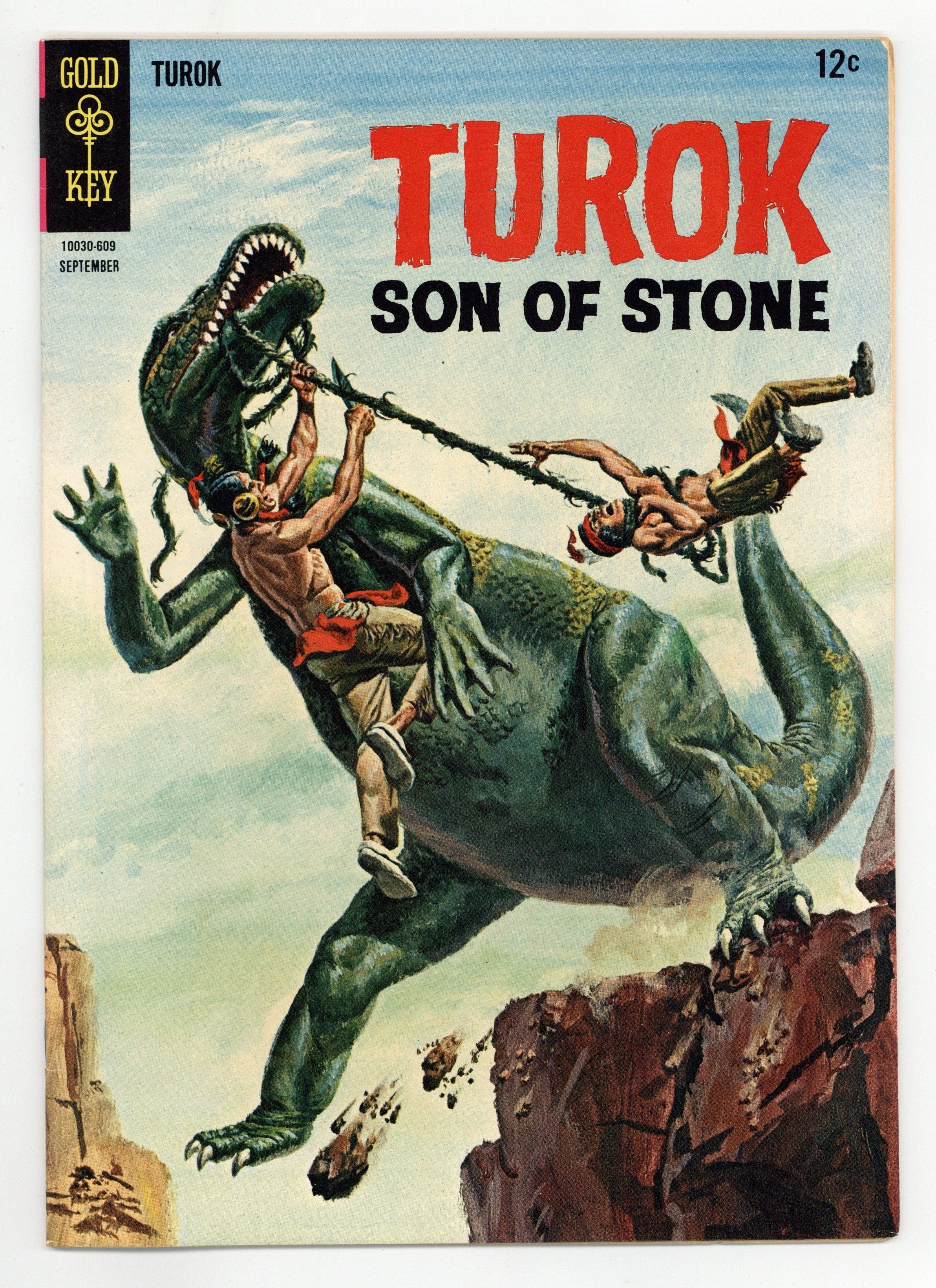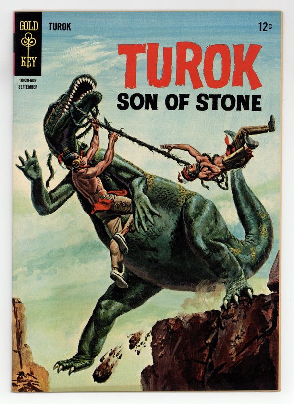 Published Sep 1966 by Dell/Gold Key.$23.50Painted cover. Turok in "Drought" in which Turok and Andar face animal and human foe during a deadly drought and "The Secret of the Black Water" in which Turok and Andar investigate a swamp of black water. Issue also has backup feature "Young Earth - The Bear Cult," a one-page text feature "Prehistoric Pioneers," and one-page strips. No art/story credits given. 36 pages, full color. Cover price $0.12.