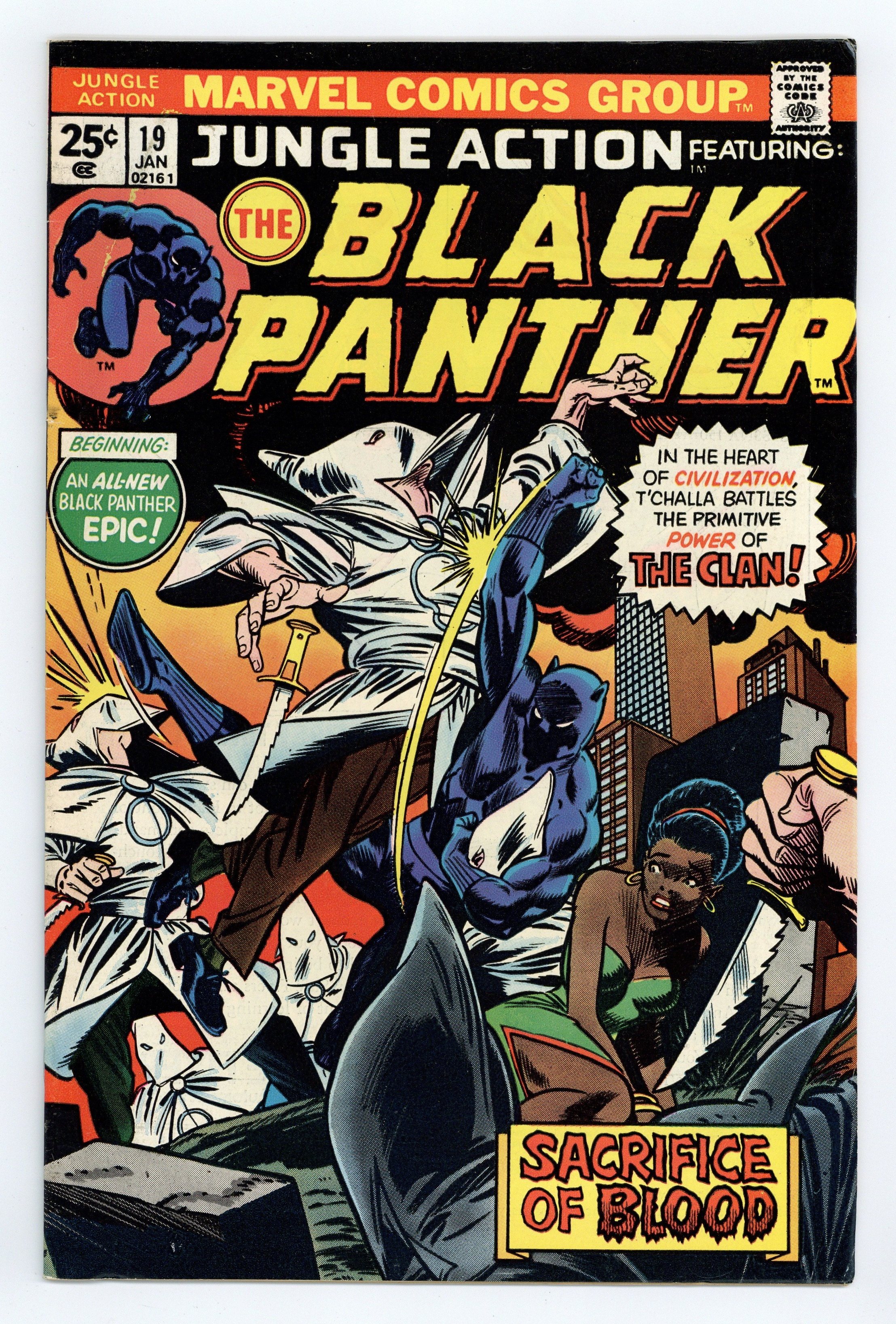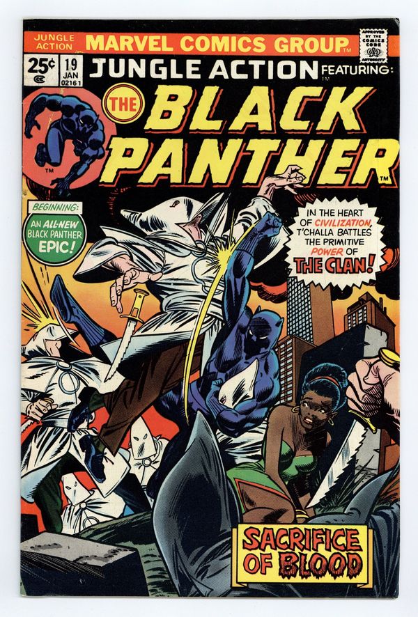 Cover pencils by Gil Kane, inks by Dan Adkins. The Black Panther stars in the Panther versus the Klan part 1, "Blood and Sacrifices, script by Don McGregor, pencils by Billy Graham, inks by Bob McLeod; The Panther and Monica visit her parents in Georgia; They are attacked by the Dragon's Circle and the Ku Klux Klan. Letters from comics writers Stan Timmons and Bruce Canwell. 36 pgs., full color. Cover price $0.25.