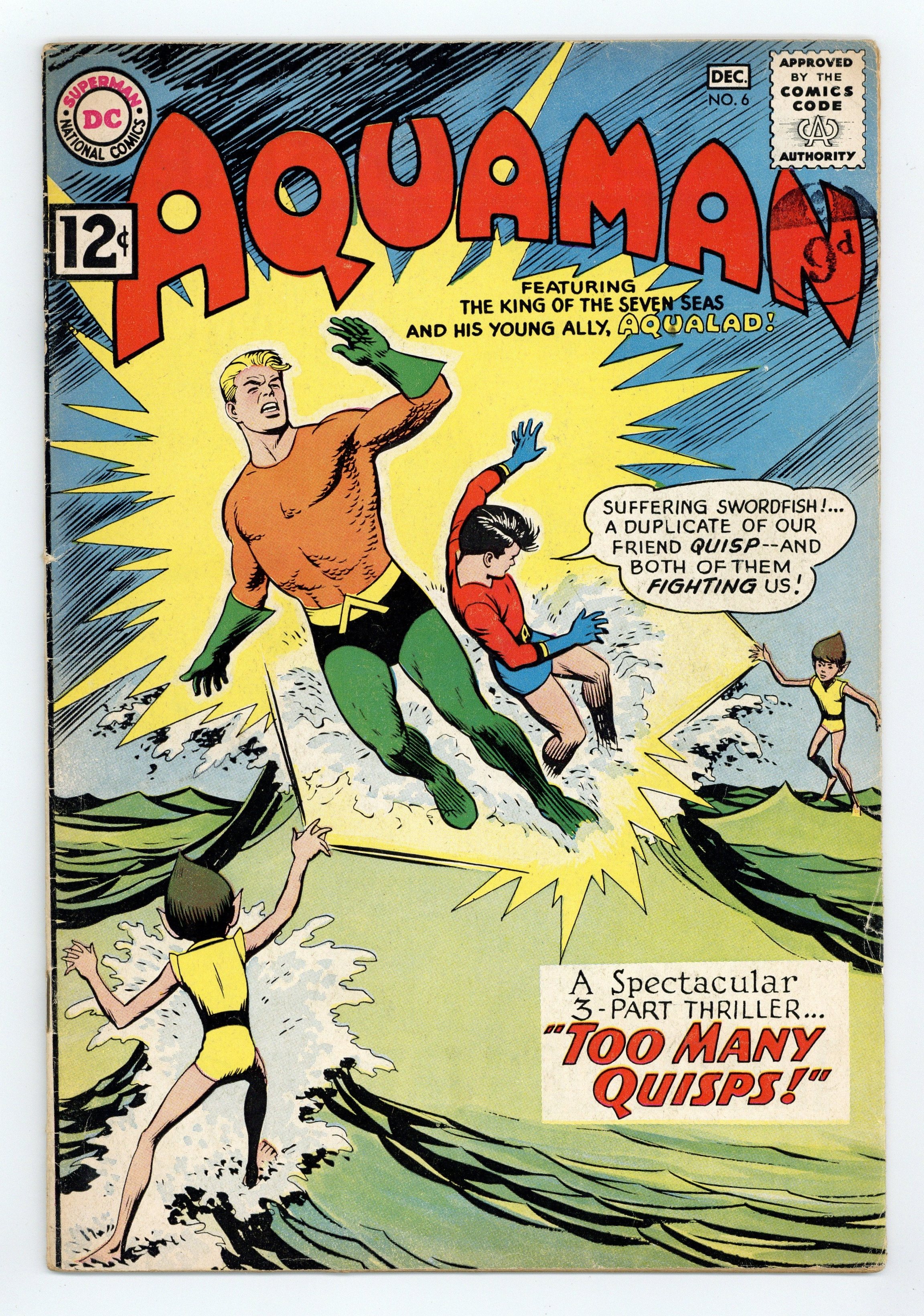 Cover art by Nick Cardy. Too Many Quisps, art by Nick Cardy; Quisp and his brother Quirp team up with Aquaman and Aqualad against Quink who has teamed up with Captain Slade and is robbing shipping. Homer humor page by Henry Boltinoff. The First Frogmen! fact two-pager. Mystery Denizens of the Deep article. 36 pgs. $0.12. Cover price $0.12.