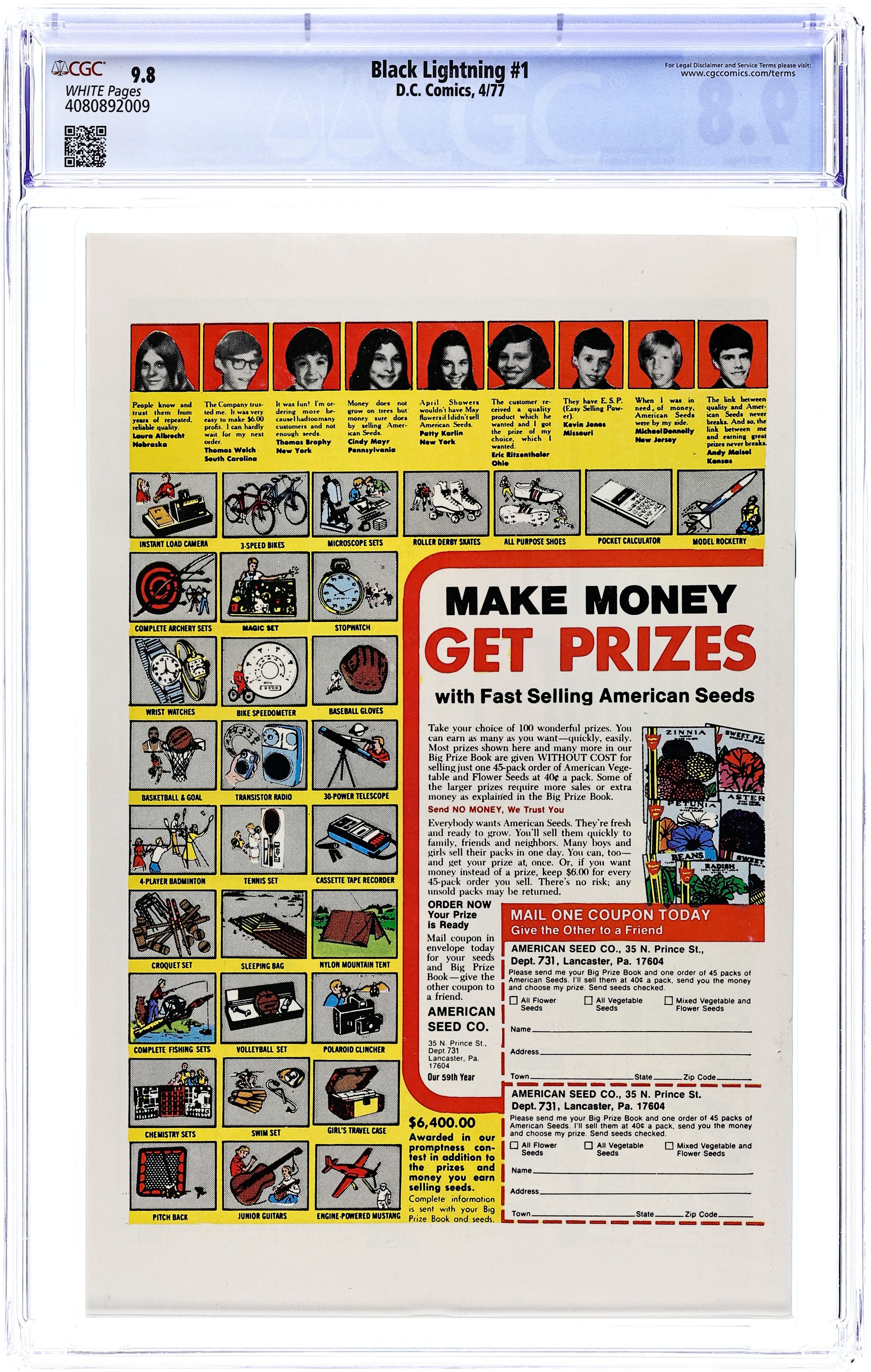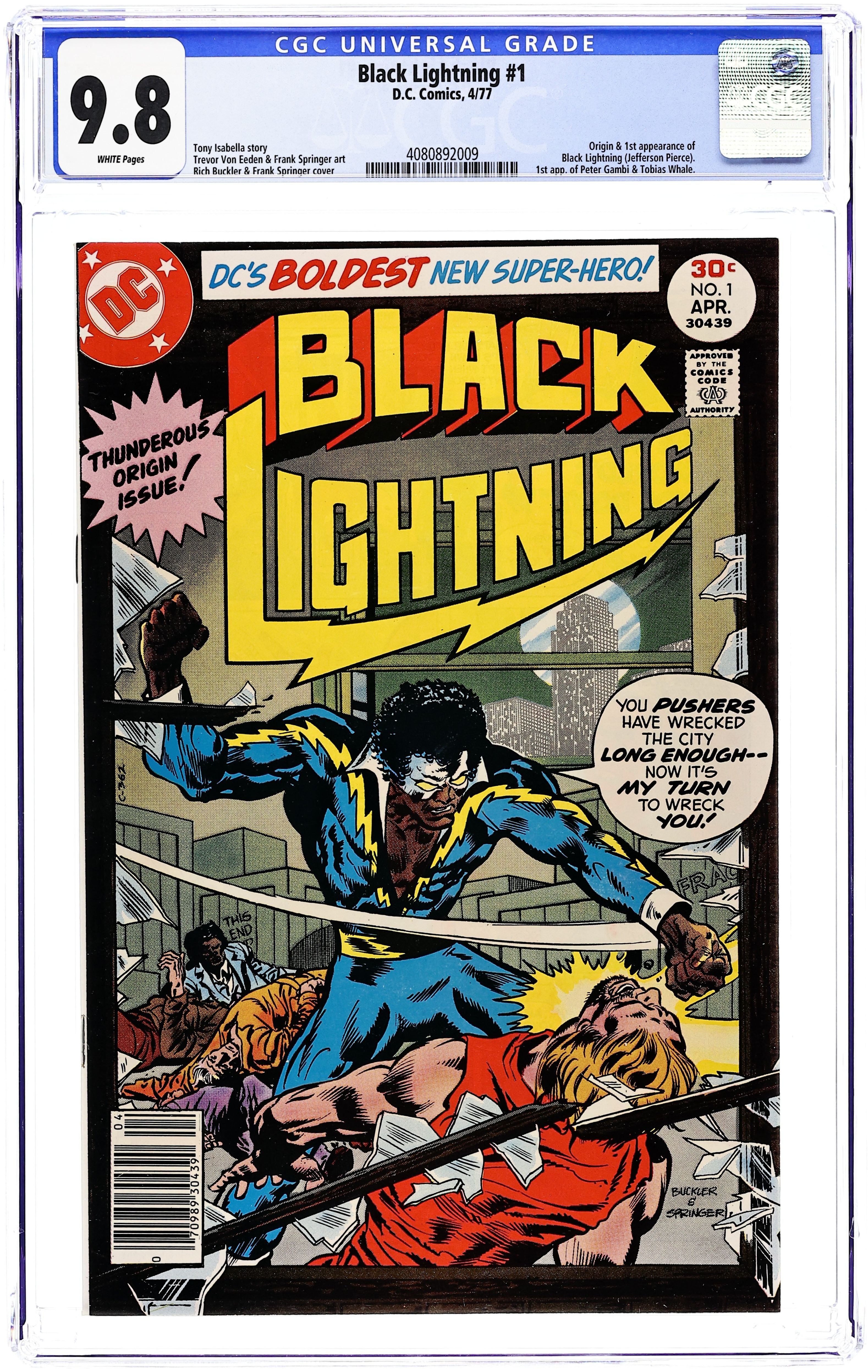 Ex-Olympic athlete Jefferson Pierce takes a job as a school teacher at an inner city school in Metropolis, commissions a costume from tailor Peter Gambi, takes on the name of Black Lightning, and goes after a group of bad guys called the 100. Script by Tony Isabella, pencils by Trevor Von Eeden, inks by Frank Springer. Cover by Rich Buckler and Springer. 1st app. of Black Lightning. Cover price $0.30.