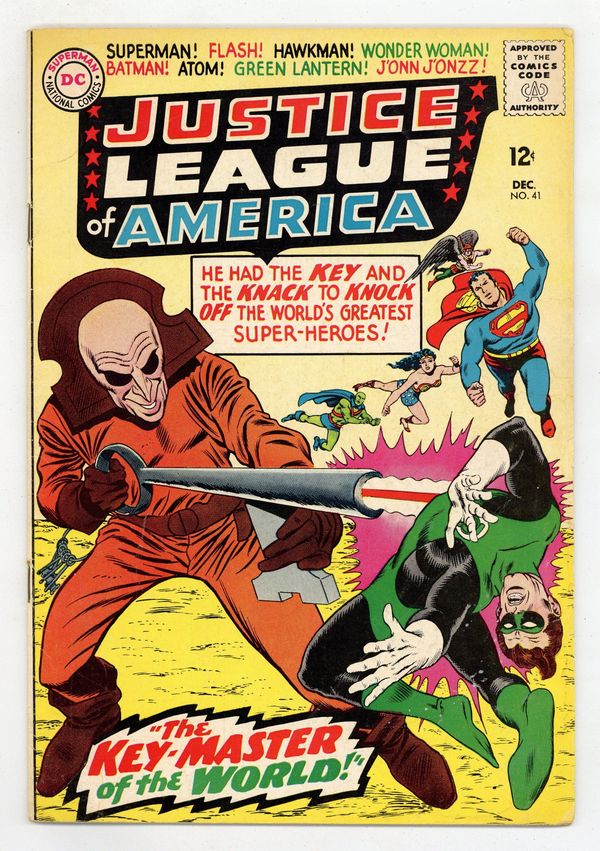 Cover pencils by Mike Sekowsky, inks by Murphy Anderson. Builders of the Future! public service announcement, art by Sheldon Moldoff. The Key-Master of the World!, script by Gardner Fox, pencils by Mike Sekowsky, inks by Bernard Sachs; The Key administers a psycho-chemical to the JLA which forces them to disband and become unable to see his henchmen commit robberies; However, they are returned to normal when Hawkgirl discovers the situation, and go on to defeat The Key. Notes field: Hawkman uses the Absorbascon to discover the secret identities of the JLA members. Cap's Hobby Center by Henry Boltinoff. Cover price $0.12.