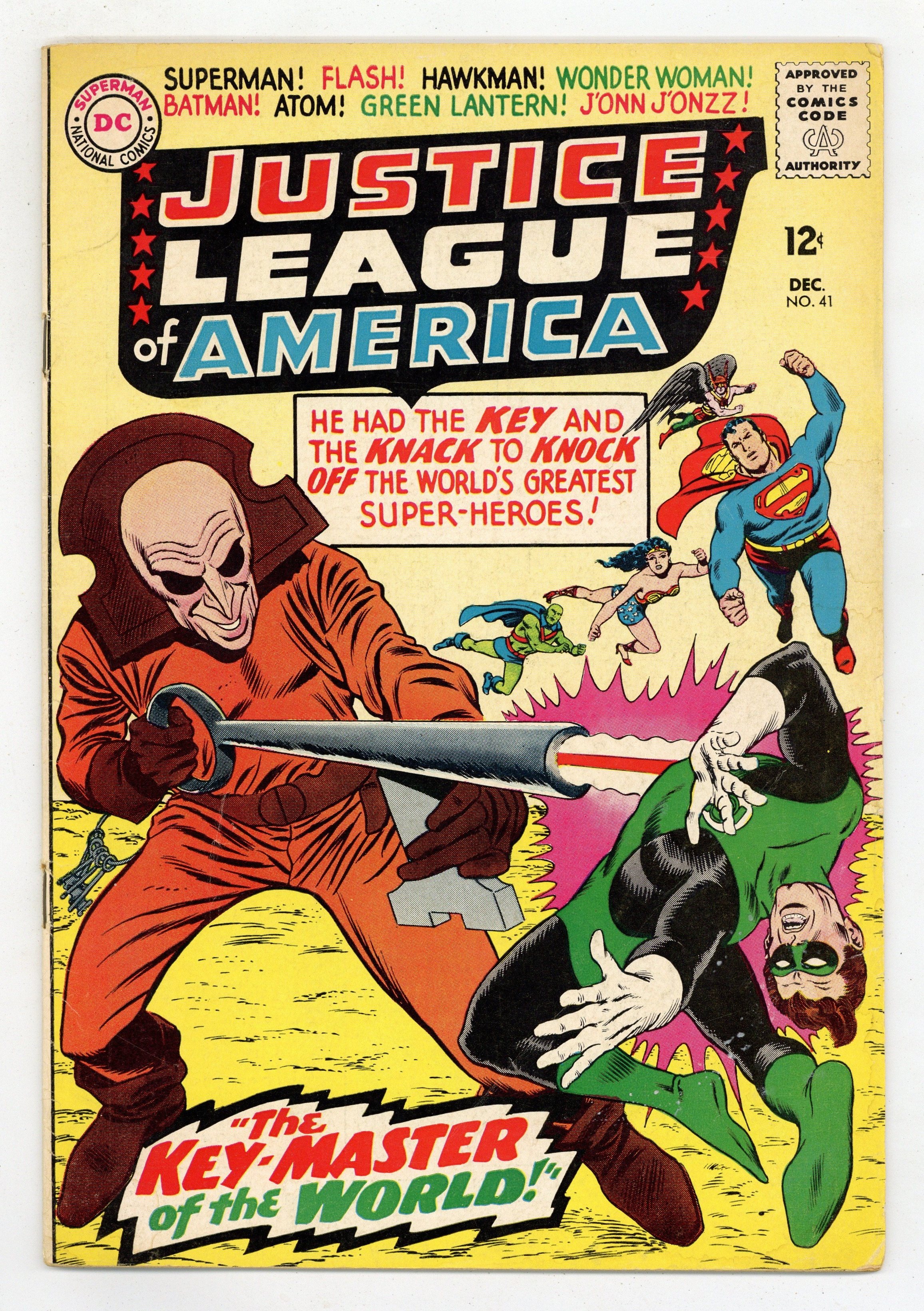 $15.00Cover pencils by Mike Sekowsky, inks by Murphy Anderson. Builders of the Future! public service announcement, art by Sheldon Moldoff. The Key-Master of the World!, script by Gardner Fox, pencils by Mike Sekowsky, inks by Bernard Sachs; The Key administers a psycho-chemical to the JLA which forces them to disband and become unable to see his henchmen commit robberies; However, they are returned to normal when Hawkgirl discovers the situation, and go on to defeat The Key. Notes field: Hawkman uses the Absorbascon to discover the secret identities of the JLA members. Cap's Hobby Center by Henry Boltinoff. Cover price $0.12.