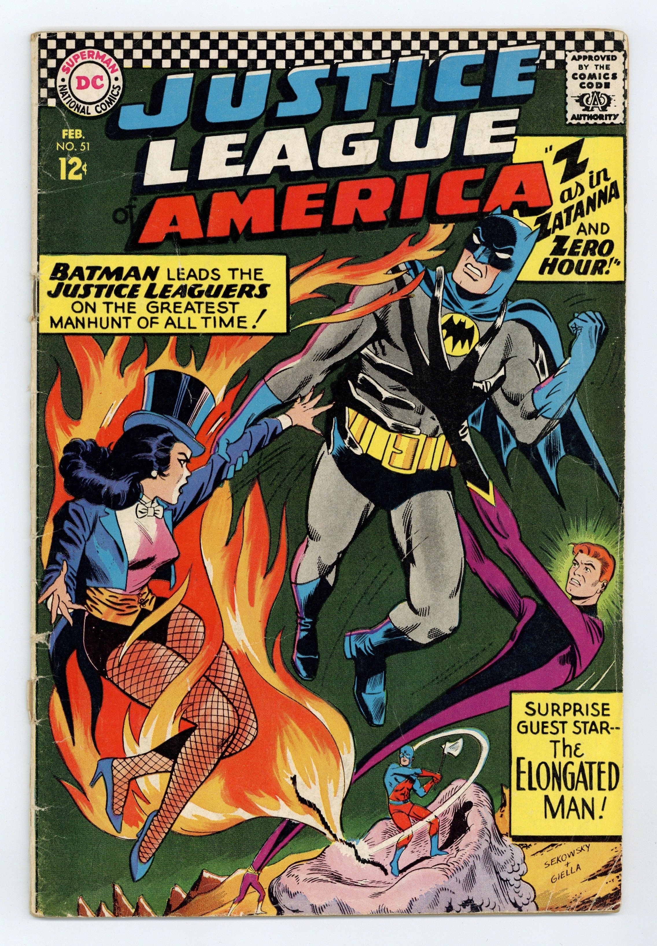 "Z--As in Zatanna--and Zero Hour!" with story by Gardner Fox, art by Mike Sekowsky and inks by Sid Greene, guest-stars Zatanna and the Elongated Man. When awesome magical powers threaten Zatanna's like as she searches for his missing father, Zatara, the Justice League of America come to the rescue! This issue's roll call: The Atom, Batman, Green Lantern and Hawkman. Full page ad for Batman poster pin-up set--just $1.00 for all. Circulation numbers reported in Statement of Ownership showing average number of copies for preceeding 12 months: 654,000. Letter in this issue from early comic fandom writer Irene Vartanoff. Cover price $0.12.