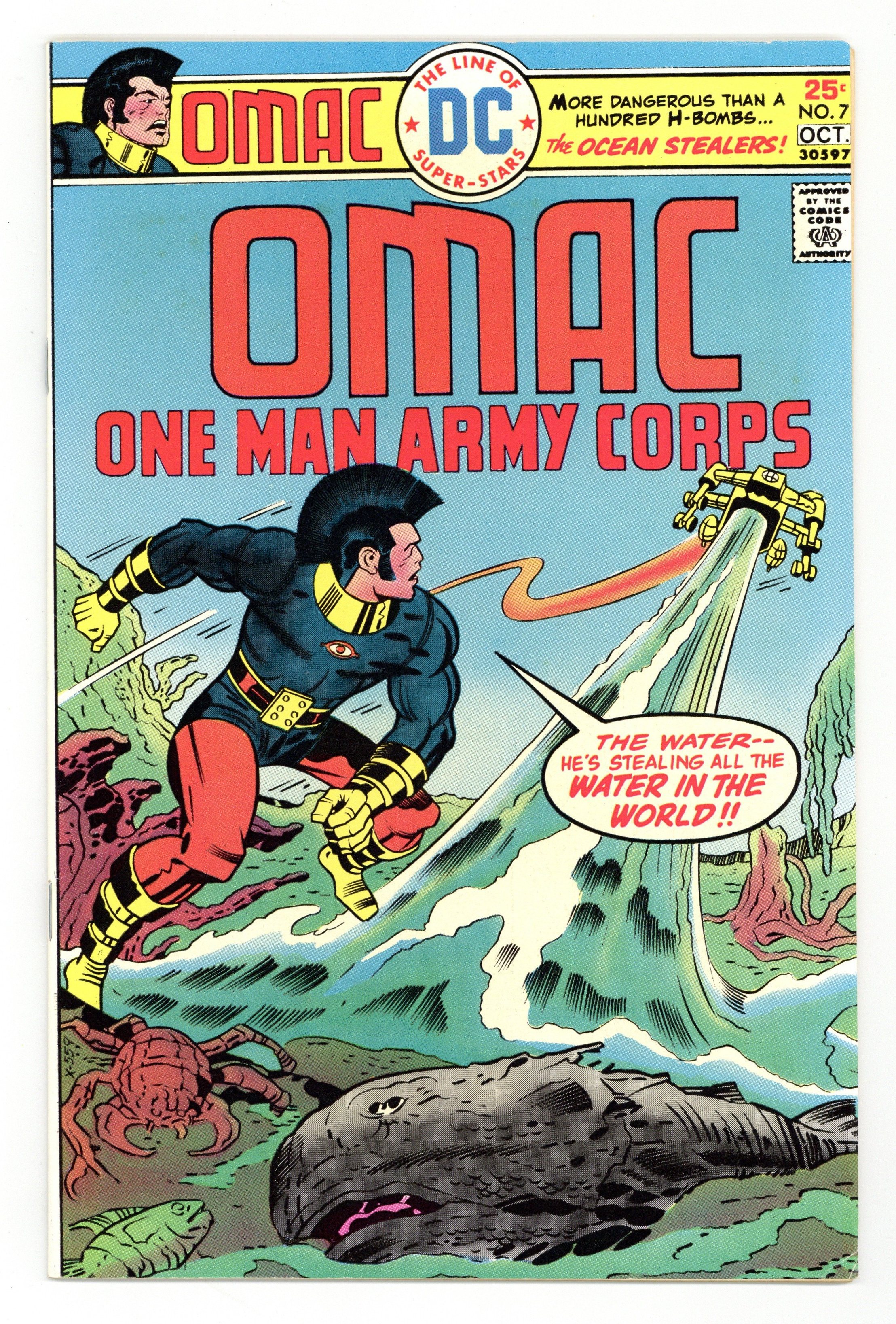 "The Ocean Stealers." Omac battles a mad scientist (Dr. Skuba), who intends to dry up Earth's oceans with an atomic weapon. Script and pencils by Jack Kirby, inks by D. Bruce Berry. Cover by Kirby and Berry. Cover price $0.25.