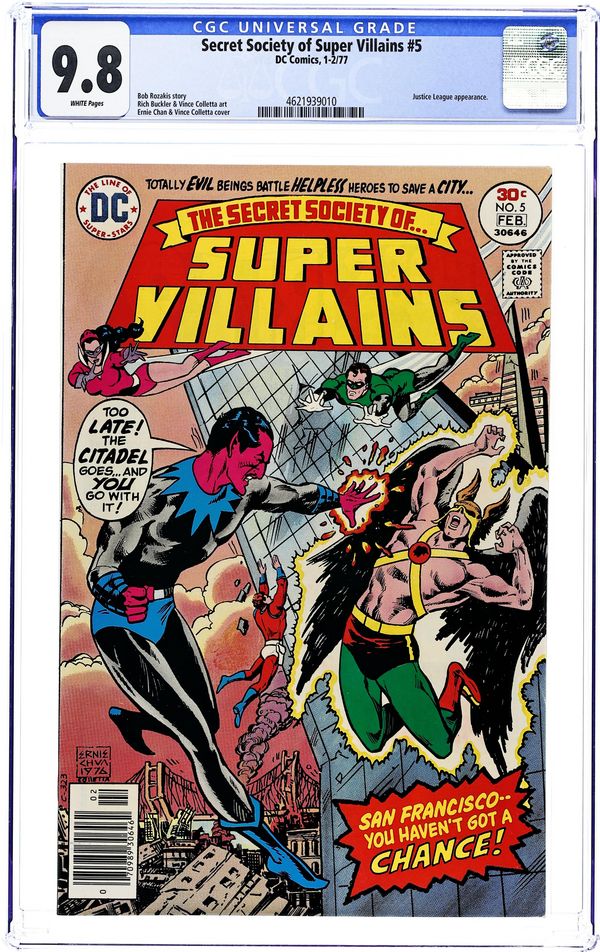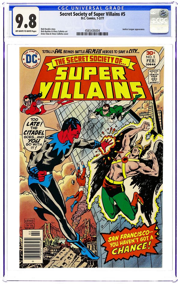 "Endgame." The Society battles Darkseid and Mantis. Green Lantern, Hawkman, and Captain Comet (who leaves the Society after meeting with the JLA) battle Sinestro. Manhunter clone dies trying to destroy Darkseid. Script by Bob Rozakis, pencils by Rich Buckler, inks by Vince Colletta. Cover by Ernie Chan and Vince Colletta. Cover price $0.30.