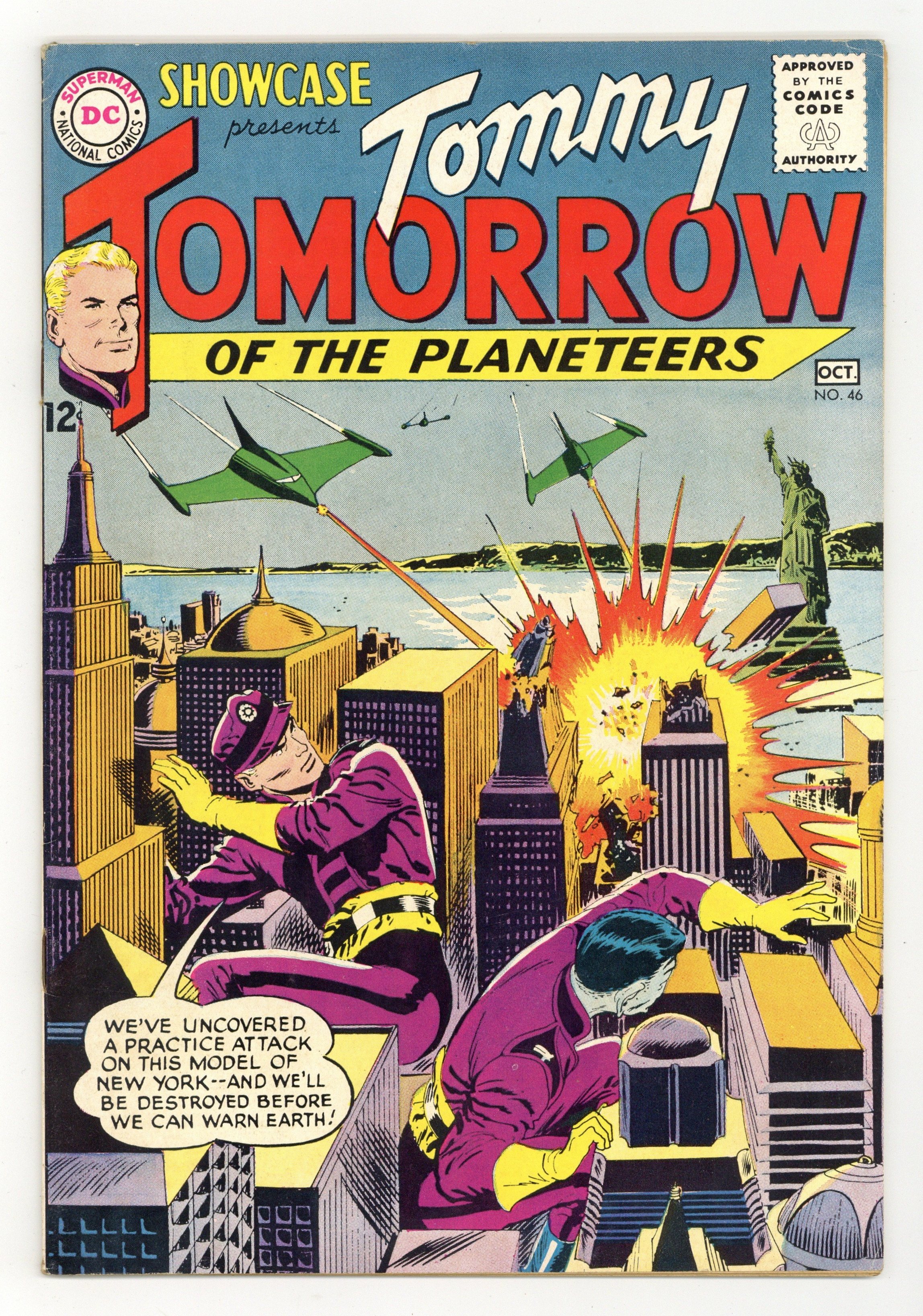 Cover art by Lee Elias. 4th Tommy Tomorrow issue. Chapter 1: Mission to Disaster, script by Arnold Drake, art by Lee Elias; Capt. Tommy Tomorrow and Capt. Lon Vurian meet with Gur Doyka, Chief Minister of the Federation of Planets; The Federation has recently made first contact with a distant solar system, and offered them a non-aggression treaty; The aliens proved suspicious and hesitated signing the pact. On the Planet Og humor page by Henry Boltinoff. Chapter 2: The Plot to Kill a Solar System, script by Arnold Drake, art by Lee Elias; Capt. Tomorrow, Capt. Vurian, and Gur Doyka are captured and imprisoned for kidnapping the boy king. Strange Secrets of the Stars article. Chapter 3: The Palace of Peril, script by Arnold Drake, art by Lee Elias; While Capt. Vurian poses as King Lorgi, the others steal a spaceship; Unfortunately, the ship they chose is almost out of fuel. 36 Pages, Full Color. Cover price $0.12.