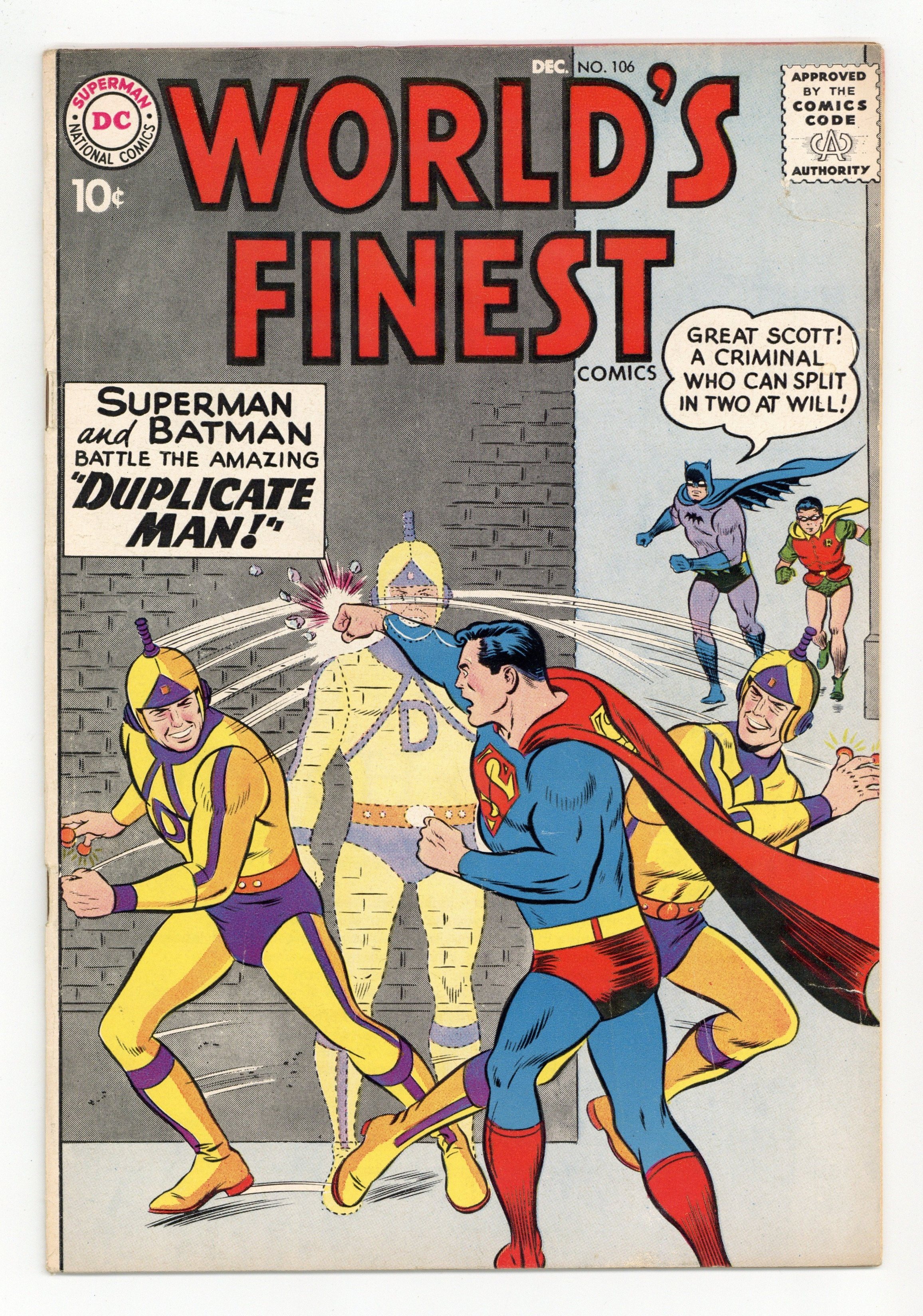 Cover pencils by Curt Swan, inks by Stan Kaye. The Duplicate Man starring Superman and Batman, script by Bill Finger, pencils by Dick Sprang, inks by Sheldon Moldoff; The Duplicate Man can split into two copies of himself, allowing him to rob to locations at once; If one version is caught, it can be recalled by the other version, thus avoiding capture. The Atom Servant of Man public service announcement, script by Jack Schiff. Professor Eureka humor page by Henry Boltinoff. The Planeteer Bodyguards starring Tommy Tomorrow, script by Jack Miller, art by Jim Mooney. Little Pete humor page by Henry Boltinoff. Crimes of the Pneumatic Man, art by Lee Elias; Green Arrow and Speedy stop the Pneumatic Man and his air-powered gadgets. 36 Pages, Full Color. Cover price $0.10.