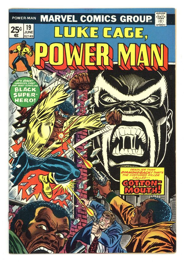 Tags: Luke Cage$12.00"Call Him...Cottonmouth!" Part 1 of 2. Script by Len Wein, pencils by George Tuska, inks by Vince Colletta. Luke Cage arrives at the office of Hero for Hire to find a package waiting for him. When he opens it, deadly serpents spring out. Luckily for our hero, their fangs can't penetrate his diamond-hard skin. This little gift was a calling card of the new player in town. A man who is every bit as strong as Power Man and probably deadlier, the gangster known as Cottonmouth. Letter to the editor from Michael Gilbert (the comics artist?). The letters page also includes Marvel Value Stamp series A # 64 (Sif by Jack Kirby). Cover price $0.25.