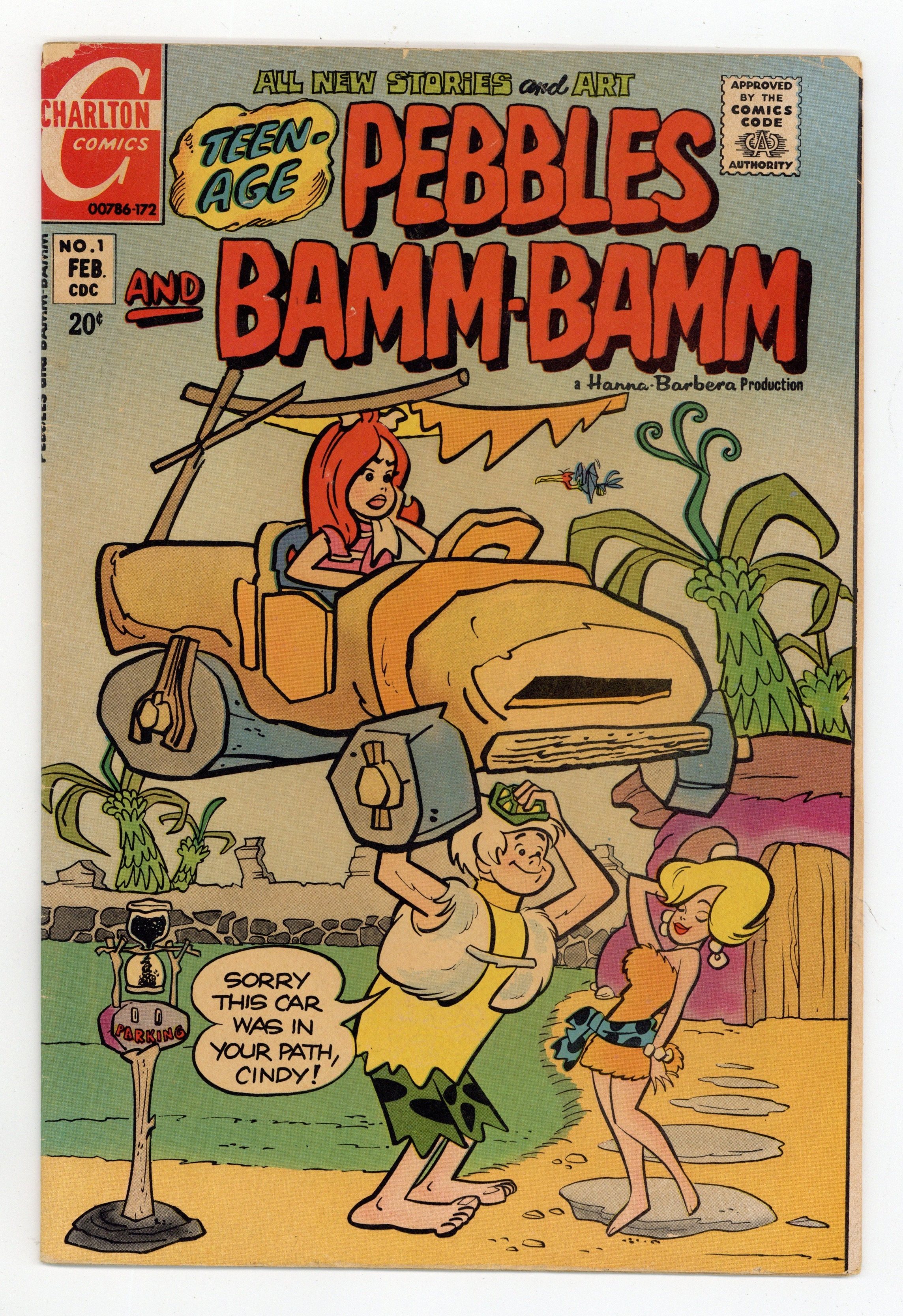 Published Jan 1972 by Charlton Comics Group.$21.00The teen-age antics of the Flintstones kids, courtesy of Charlton Comics. Bamm-Bamm and his genius friend Moonrock figure out how to get Cindy's attention at the dance by using butterscotch syrup. Bamm-Bamm saves an oblivious Fred from many dangers when they visit the fair. Pebbles and Bamm-Bamm find ways to sabotage Fabian's date with Cindy after he stands-up Pebbles. Bedlam in Bedrock; Stung Again; Don't Bet on a Pet; The Rubber Worm; Fun at the Fair. 32 pages, Full Color. Cover price $0.20.