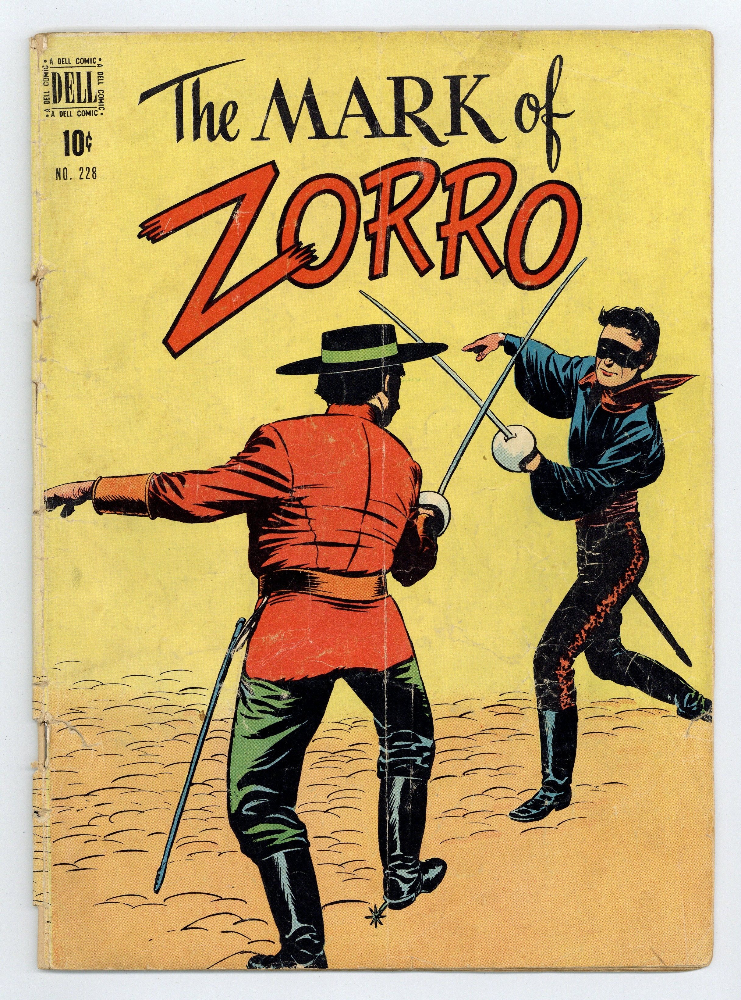 Indicia title is "THE MARK OF ZORRO, No. 228." Cover art by Bill Ely. The Mark Of Zorro, art by Bill Ely; Captain Ramon seeks the hand of the lovely Lolita Pulido; The senorita's parents wish her to marry Don Diego Vega, but she finds him dull; Don Diego, as Zorro, tries to get the senorita and her parents to help him fight the corrupt governor, but her father calls for the soldiers; Lolita is infatuated with Zorro, who has to protect her from Captain Ramon's unwanted advances; Ramon convinces the Governor to jail Lolita and her family; Zorro then organizes a party to free the Pulidos from jail. Adapted from the 1924 novel "The Mark of Zorro" by Johnston McCulley. 36 pages, full color. Cover price $0.10.