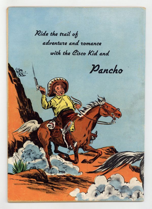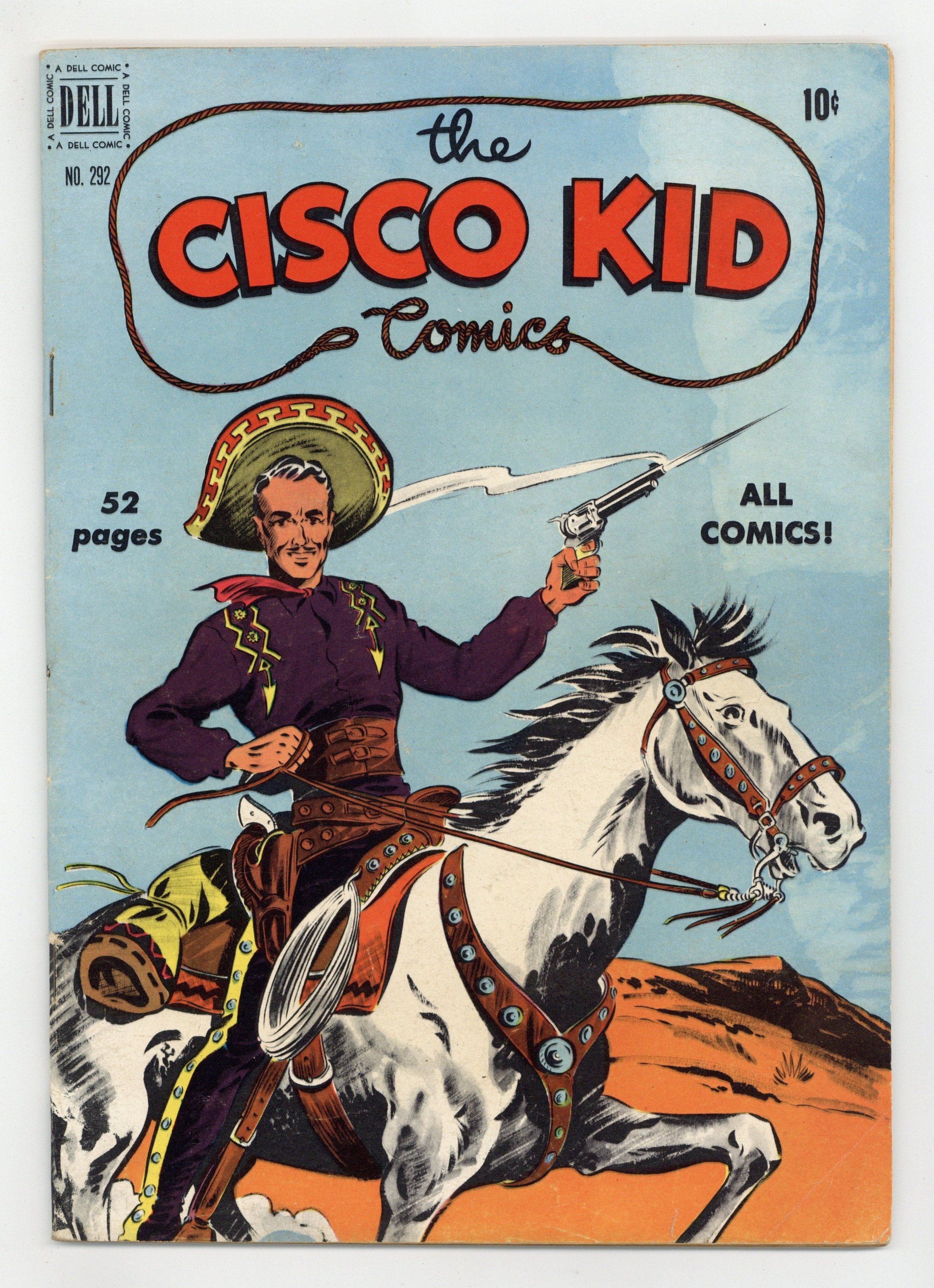 $35.00Indicia title is "CISCO KID COMICS, No. 292." Cover art by Bob Jenney. History of Western Saddles fact page. The Cisco Kid and the Red Deuce Gang; In a New Mexican town, Cisco and Pancho stop a man from bothering a woman; The woman is traveling north to Pueblo to meet her uncle, Tim Garrity, who is the sheriff. The Outlaws of Big Drum Ridge; Cisco and Pancho come across the aftermath of a stage coach robbery, which has left one man dead and the driver wounded. Cowboy Outfits fact page. All art by Bob Jenney. 52 pages, full color. Cover price $0.10.