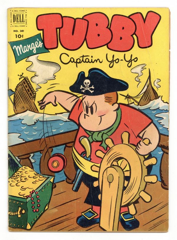 Marge's Tubby (#1). Indicia title is "MARGE'S TUBBY, CAPTAIN YO-YO, No. 381." Captain Yo-Yo, script by John Stanley; While playing pirate with the gang, Tubby is left marooned on Pine Tree Island. While on the island, he dreams of having adventures as captain of a pirate ship. 36 pages, full color. Cover price $0.10.